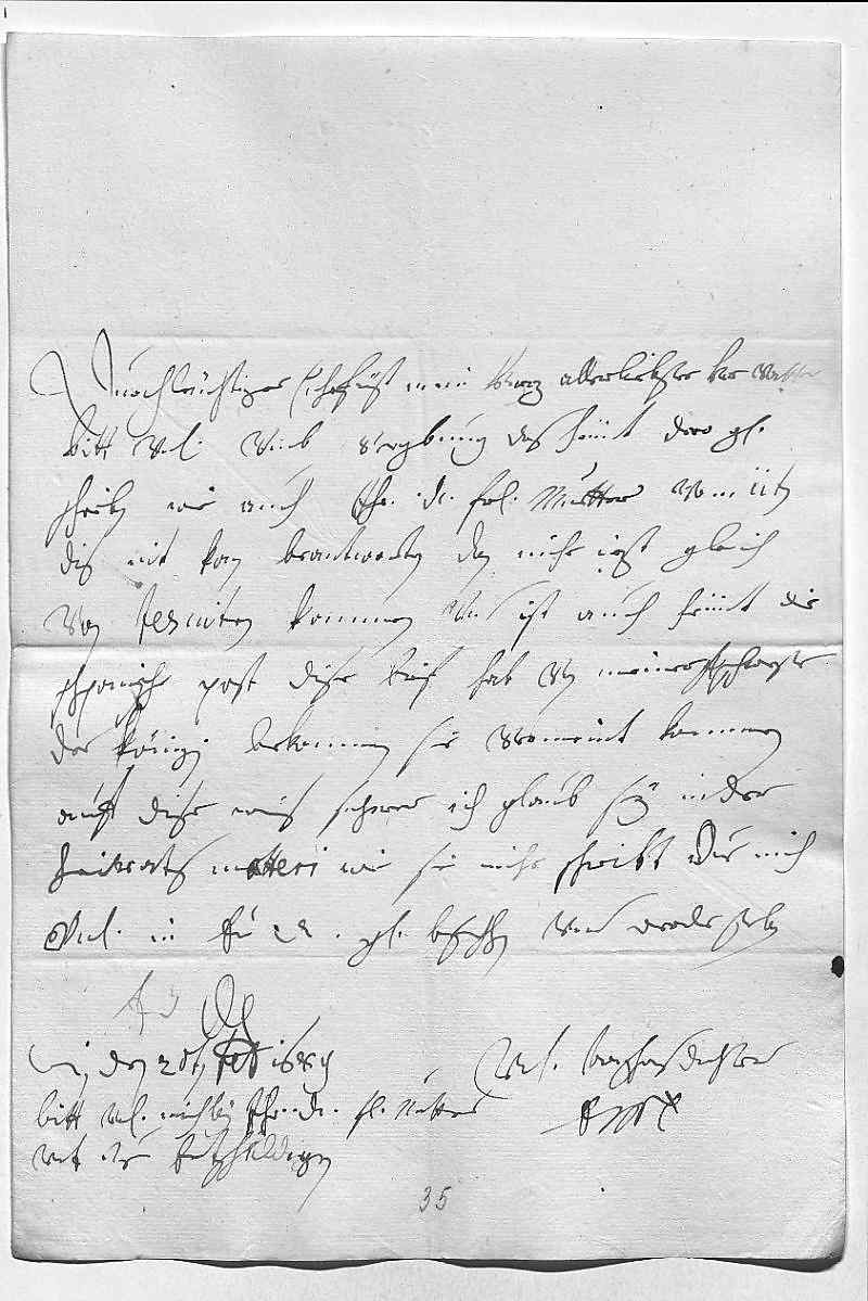 0001Durchleüchtiger Cuhrfürst, mein herz allerliebster her vatter 0002Bitt vnterdehnigst vmb vergebung, das heünt dero gnädiges 0003schreiben wie auch das ihr Durchlaucht fraw muetter vom 11ten0004dis nit kan beantworten, dan mihr iezt gleich 0005von jesuiten kommen, vnd ist auch heünt die 0006schpanische post. Dise brif hab von meiner fraw schwester, 0007der Königin, bekommen, sie vermeint, sie kommen 0008auff dise weis sicherer. Ich glaub, es sey in der 0009heirats matteri, wie sie mihr schreibt. Due mich 0010vnterdehnigst in ewer Durchlaucht gnade befehlen vnd werde sterben 0011ewer Durchlaucht 0012vnterdehnigste trewgehorsamste dochter 0013EMT 0014Wien den 20ten februarij 16890015Bitt vnterdehnigst, mich bey ihr Durchlaucht fraw mutter 0016vnterdehnigst zue entschuldigen.