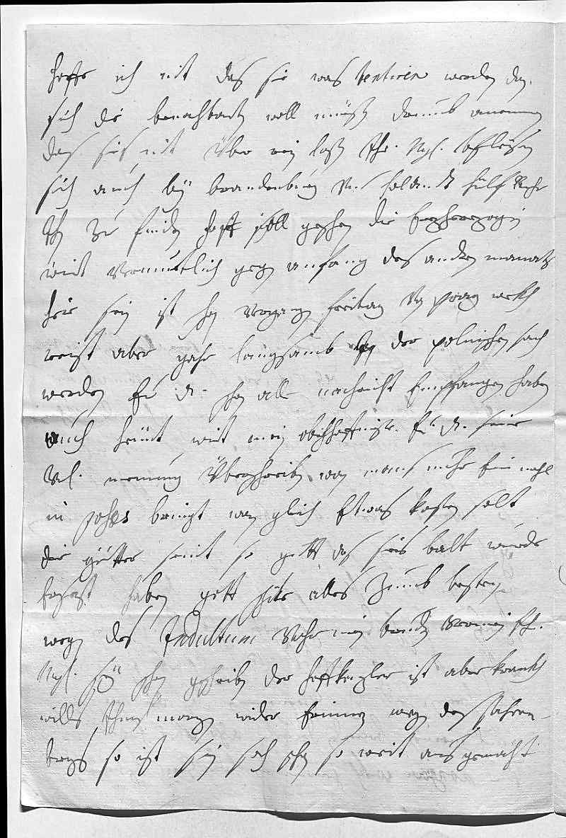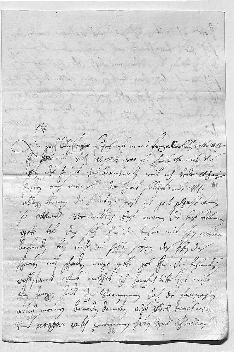 0001Durchleüchtiger Cuhrfürst, mein herzallerliebster herr vatter 0002Ich kom mit vnterdehnigstem respect, dero gnädige schreiben vom 11ten vnd 000315ten dis heünt zue beantworten, weil ich bede vohrige 0004posten aus mangel der zeit solches nit vnterdehnigst 0005ablegen können. Die heüntige post ist gahr schpaht komen, 0006so werdt vermuetlich erst morgen die brif bekommen. 0007Gott lob, das sich ewer Durchlaucht beßer mit ihren cattarr 0008befinden, bin nuhr in stehten sorgen, das ihnen das 0009schreiben nit schaden möge. Gott geb ewer Durchlaucht bestendigen 0010wohlstandt, vmb welches ich herzlich bitte. Ist mihr 0011von herzen leidt zue vernemmen, das die franzosen 0012auch meinen bruedern drunten also übel tractiren 0013vnd Mongau wekh genommen haben. Zue Dißeldorf