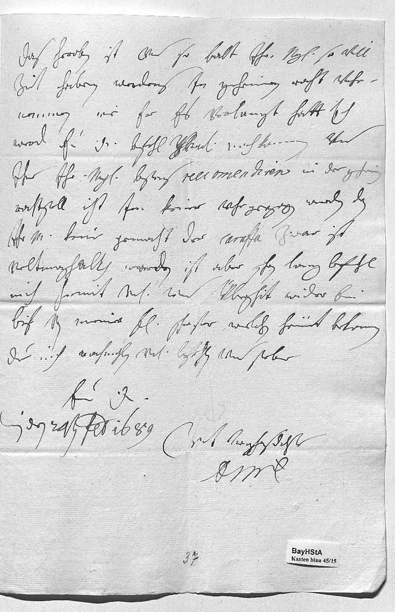 0032das heroben ist, vnd so balt ihr Mayestät so vill 0033zeit haben, werdens in geheimen raht vohr- 0034nemmen, wie er es verlangt hatt. Ich 0035werd ewer Durchlaucht befehl vnterdehnigst nachkommen vnd 0036ihne ihr Mayestät bestens reccomendiren. In der geheimen 0037rahtstell ist im keiner vohrgezogen worden, dan 0038ihr Mayestät hat keine gemacht. Der Caraffa zwar ist 0039Veltmarschalkh worden, ist aber schon lang Geheimer Rat. Befehl 0040mich hermit vnterdehnigst vnd überschik wider ein 0041brif von meiner fraw schwester, welchen ich heünt bekommen habe. 0042Due mich nochmahlen vnterdehnigst befehlen vnd sterbe 0043ewer Durchlaucht 0044vnterdehnigste trewgehorsamste dochter 0045EMT 0046Wien den 24ten februarij 1689