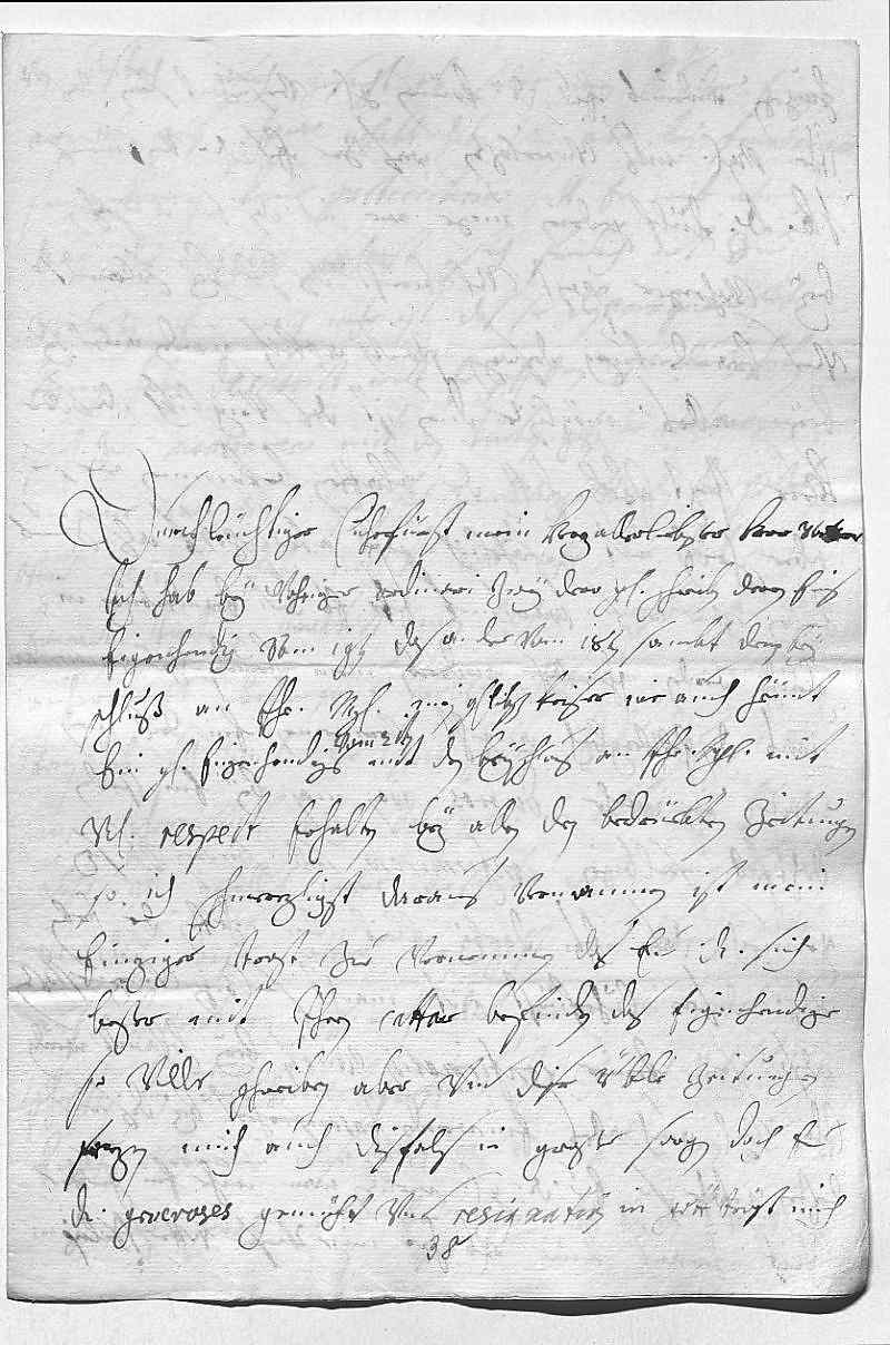 0001Durchleüchtiger Cuhrfürst, mein herzallerliebster herr vatter 0002Ich hab bey vohriger ordinari post zwey dero gnädigen schreiben, deren eins 0003eigenhendig vom 19ten, das ander vom 18ten, sambt denen bey- 0004schluß an ihr Mayestät, mein gelibsten Keiser, wie auch heünt 0005ein gnädiges eigenhendiges vom 21ten mit den beyschlus an ihr Mayestät mit 0006vnterdehnigstem respect erhalten. Bey allen den bedrüebten zeitungen, 0007so ich schmerzligst daraus vernommen, ist mein 0008einziger trost zue vernemmen, das ewer Durchlaucht sich 0009beßer mit ihren cattar befinden. Das eigenhendige 0010so ville schreiben aber vnd dise üble zeitungen 0011sezen mich auch disfals in große sorgen, doch ewer 0012Durchlaucht generoses gemühet vnd resignation in gott tröst mich