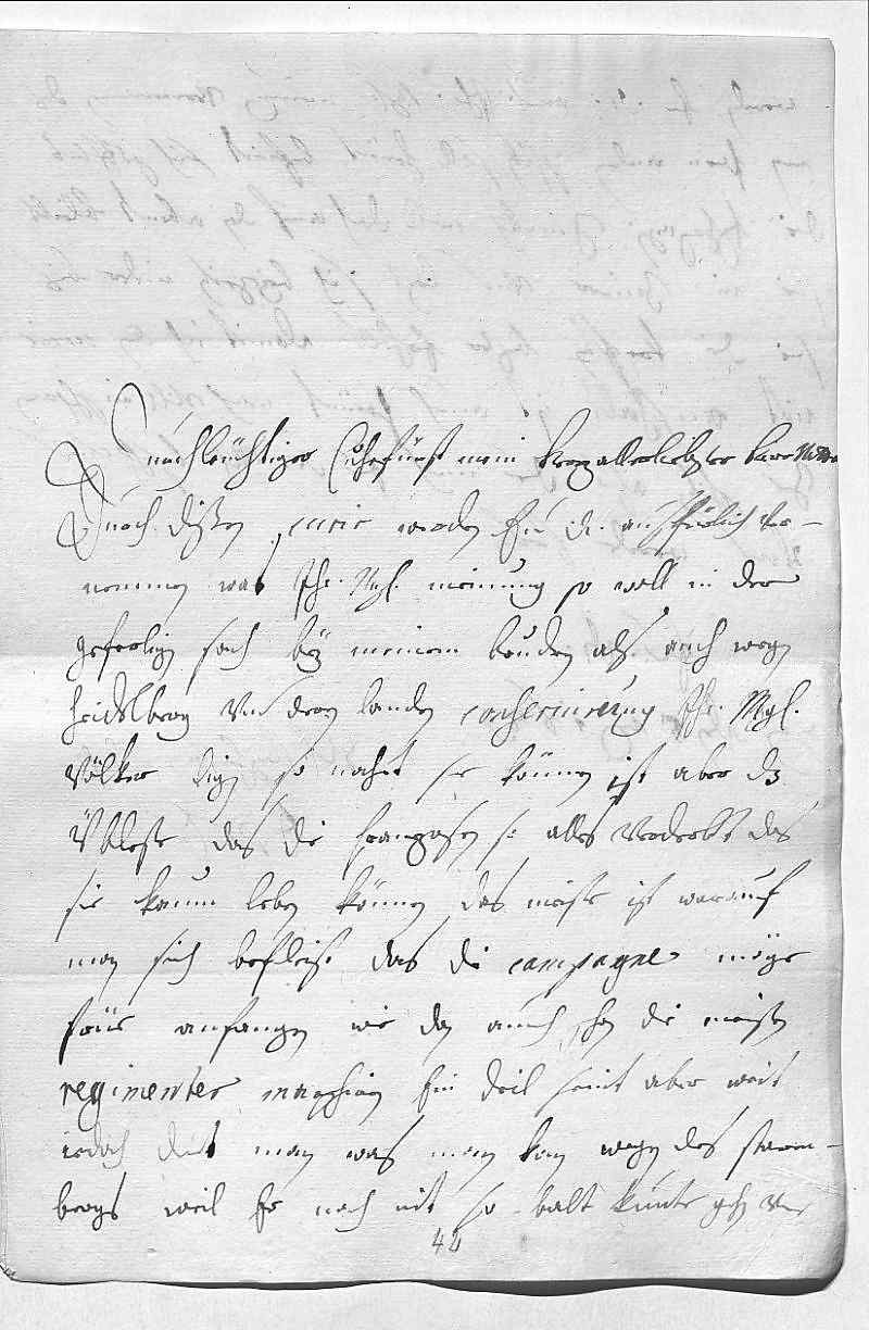 0001Durchleüchtiger Cuhrfürst, mein herzallerliebster herr vatter 0002Durch dißen curir werden ewer Durchlaucht ausfürlich ver- 0003nemmen, was ihr Mayestät meinung so woll in der 0004geferligen sach bey meinem brudren, als auch wegen 0005Heidelberg vnd deren landen conseruirung ist. Ihr Mayestät 0006völker ligen so nahet sie können, ist aber das 0007übleste, das die franzosen so alles verderbt, das 0008sie kaum leben können. Das meiste ist, warauf 0009man sich befleist, das die campagne möge 0010früe anfangen, wie dan auch schon die meisten 0011regimenter marschiren, ein deil seint aber weit, 0012iedoch duet man, was man kan. Wegen des Staren- 0013bergs, weil er noch nit so balt kunte gehn, vnd