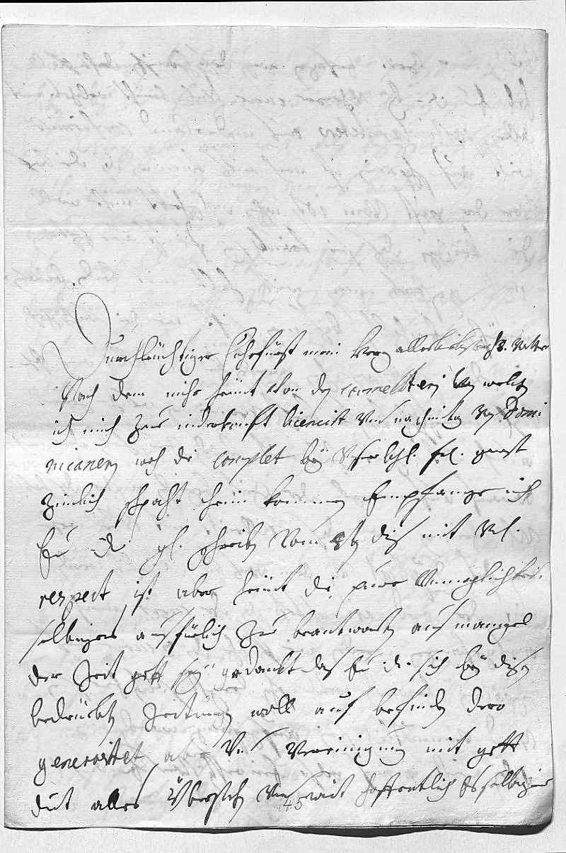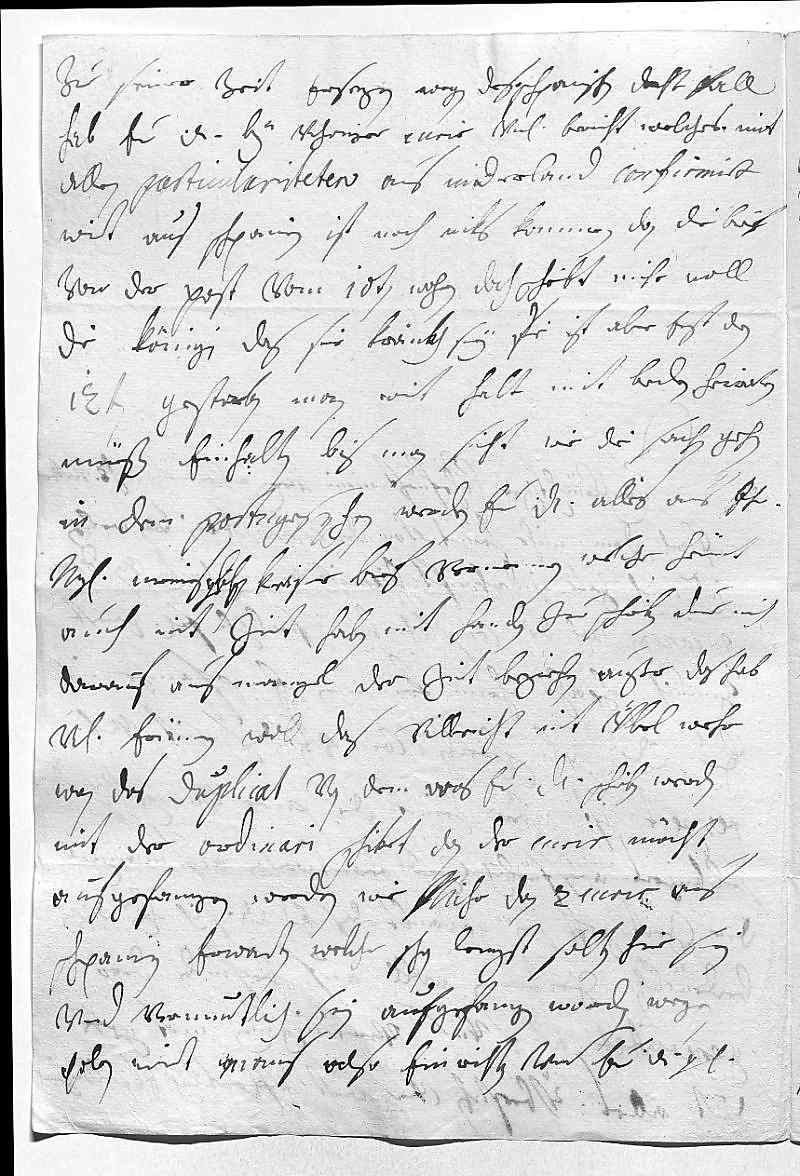 0001Durchleüchtiger Cuhrfürst, mein herz allerliebster herr vatter 0002Nach dem mihr heünt von den carmeliterin, von welchen 0003ich mich zue niderkonft licencirt habe, vnd nachmitag von domi- 0004nicanern, woh die complet bey vnser lieben fraw gewest, 0005zimlich schpaht heim kommen, empfange ich 0006ewer Durchlaucht gnädiges schreiben vom 8ten dis mit vnterdehnigstem 0007respect. Ist aber heünt die pure vnmoglichkeit, 0008selbiges ausfürlich zue beantworten aus mangel 0009der zeit. Gott sey gedankt, das ewer Durchlaucht sich bey disen 0010bedrüebten zeitungen woll auf befinden, dero 0011generositet aber vnd vereinigung mit gott 0012duet alles überstehen vnd wirt hoffentlich es selbiger
