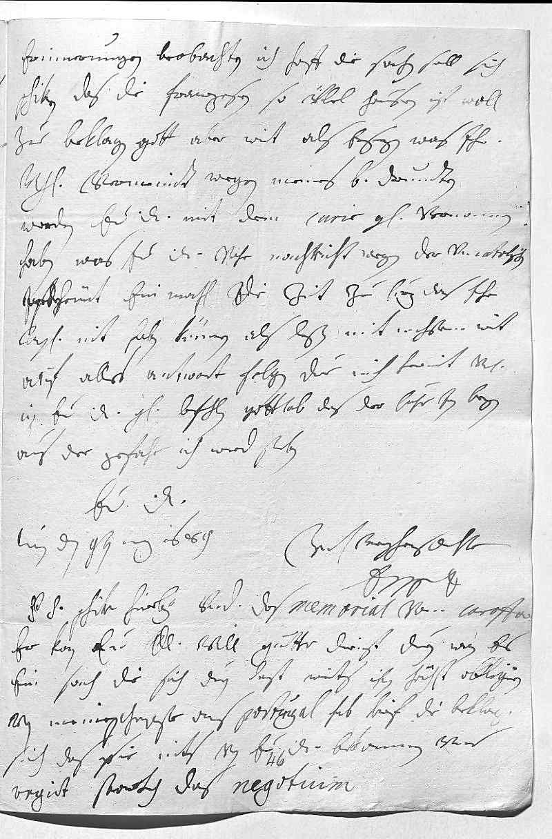 0032erinnerungen beobachten, ich hoff, die sachen soll sich 0033schiken. Das die franzosen so übel hausen, ist woll 0034zue beklagen, gott aber wirt als ersezen. Was ihr 0035Mayestät vermeindt wegen meines bruders drundten, 0036werden ewer Durchlaucht mit dem curir gnädigst vernommen 0037haben. Was ewer Durchlaucht vohr nachricht wegen der vncatolischen schreiben, 0038ist heünt ein mahl die zeit zu curz, das ihr 0039Mayestät nit haben können als leßen, mit nechstem wirt 0040auf alles antwort folgen. Due mich hermit vnterdehnigst 0041in ewer Durchlaucht gnade befehlen. Gottlob, das der Cuhrfürst von Beyren 0042aus der gefahr. Ich werd sterben 0043ewer Durchlaucht 0044vnterdehnigste trewgehorsamste dochter 0045EMT 0046Wien den 9ten merz 16890047Postscriptum Schike hierbey vnterdehnigst das memorial vom Caraffa . 0048Er kan ewer Durchlaucht vill gutte dienst duen, wan es 0049ein sach, die sich duen last, wirts ihn höchst obligiren. 0050Von meiner schwester aus Portugal hab brif, die beklagt 0051sich, das sie niks von ewer Durchlaucht bekommen, vnd 0052urgirt starkh das negotium.