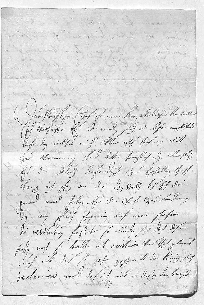 0001Durchleüchtiger Cuhrfürst, mein herz allerliebster herr vatter 0002Ich verhoffe, ewer Durchlaucht werden sich in bestem wohlstand 0003befinden, welches mich über als erfreien wirt 0004zue vernemmen, vnd bitte herzlich den almechtigen, 0005ewer Durchlaucht dabey bestendigst zue erhalten. Jezt 0006vang ich schon an die dag zehlen, bis ich die 0007gnad werd haben, ewer Durchlaucht vnterdehnigst zue bedienen, 0008dan wan gleich Schpanien auf mein schwester 0009die resolution faßte, so wurden sich doch dise 0010sachen noch so balt nit aiustiren, vnd ich glaub 0011auch nit, das so gahr geschwint der König sich 0012declariren werd, das ich nit in deßen den trost