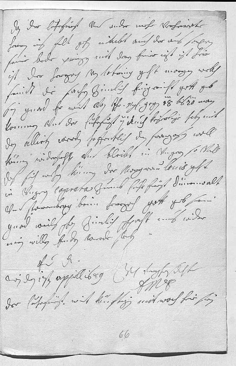 0034dan der Cuhrfürst vnd ander mehr verheirate 0035herrn ins felt gehen, nimbt auch der aus Saxen 0036seine bede Prinzen mit, deren einer iezt ist hier 0037ist. Der Herzoch von Lotring geht morgen wekh, 0038seindt die sachen zimlich eingericht, gott geb 0039sein gnad. Er wirt von ihr Mayestät gegen 18000 bis 20000 man 0040bekommen vnd der Cuhrfürst 7000 auch keiserlige haben. Mit 0041den allirten werden sie hoffentlich den franzosen woll 0042können widerstehen, vnd bleibt in Vngern so vill, 0043das sie sich wehren können. Der Margrau Louis geht 0044in Vngern, Caprara zumb Cuhrfürst, Dünenwalt 0045vnd Staremberg beim Herzoch, gott geb sein 0046gnad. Weils schon zimlich schpaht, mus wider 0047mein willen enden, werde sterben 0048ewer Durchlaucht 0049vnderdehnigste trewgehorsamste dochter 0050EMT 0051Wien den 17ten apprill 16890052Der Cuhrfürst wirt könftigen mitwoch hier sein.
