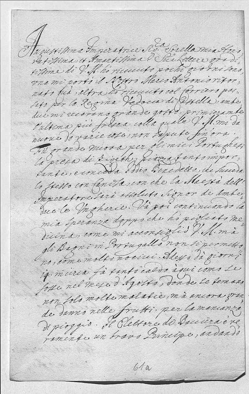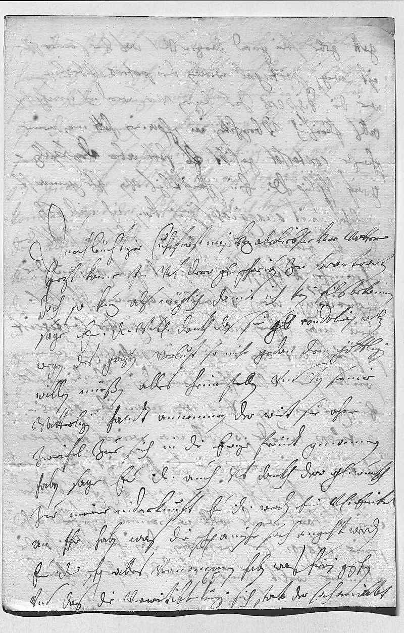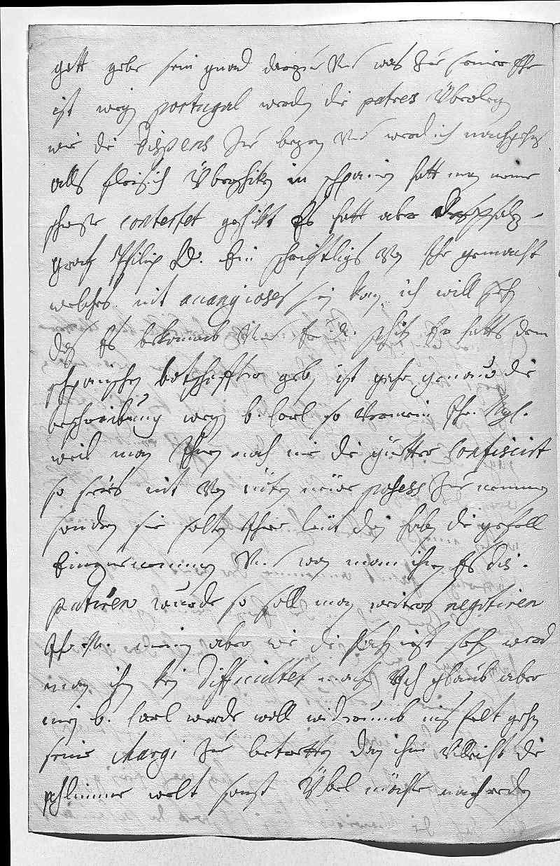 0014gott gebe sein gnad darzue vnd was zue seiner ehr 0015ist. Wegen Portugal werden die patres überlegen, 0016wie die dispens zue begern ist, vnd werd ich nachgehns 0017alles fleisich überschiken. In Schpanien hatt man meiner 0018schwester conterfet geschikt. Es hatt aber der Pfalz- 0019graf Pfilip Liebden ein schriftligs von ihr gemacht, 0020welches nit auangioser sein kan, ich will sehen, 0021das es bekommb vnd ewer Durchlaucht schik. Er hatts dem 0022schpanischen Botschaffter geben, ist gahr genaw die 0023beschreibung. Wegen bruder Carl, so vermeinen ihr Mayestät, 0024weil man ihnen noch nie die güetter confiscirt hat, 0025so seies nit von nöten, newe posess zue nemmen, 0026sondren sie solten ihre leüt drin haben die gefell 0027einzuenemmen, vnd wan man ihnen es dis- 0028putiren wurde, so soll man weiters negotiren. 0029Ihr Mayestät meinen aber, wie die sachen iezt stehen, werd 0030man ihnen kein difficultet machen. Ich glaub aber, 0031mein bruder Carl werde woll widerumb ins felt gehen, 0032seine chargi zue betretten, dan ihm villeicht die 0033schlimme welt sonst übel möchte nachreden,