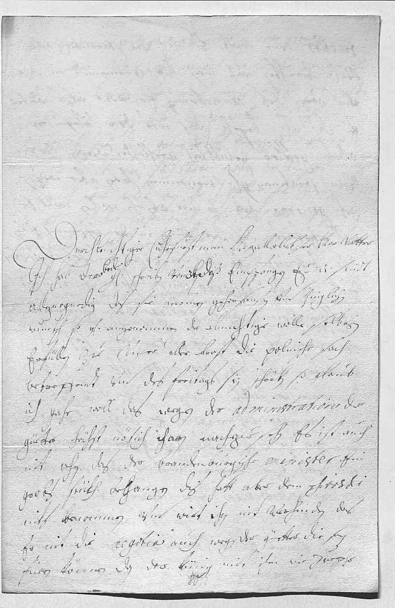 0001Durchleüchtiger Cuhrfürst, mein herzallerliebster herr vatter 0002Ich hab dero bede gnädige schreiben vom 3ten diß empfangen. Ewer Durchlaucht seindt 0003allzuegnedig, das sie meinen gehorsamsten vnd inigligen 0004wuntsch so gnädig angenommen, der almechtige wolle selbigen 0005erfüllen zue unser aller trost. Die polnische sach 0006betreffendt vnd des Freitags sein schreiben, so glaub 0007ich gahr woll, das wegen der administration der 0008güetter höchst nötich, ihnen nachzuesehn. Es ist auch 0009nit ohn, das der brandenburgische minister ein 0010grobs stükh begangen, dis hatt aber dem Schiroski 0011niks benommen vnd wirt ihn nit verhindern, das 0012er nit die negotia, auch wegen der güetter die sach 0013füren können, dan der König mit ihm wie zuefohr