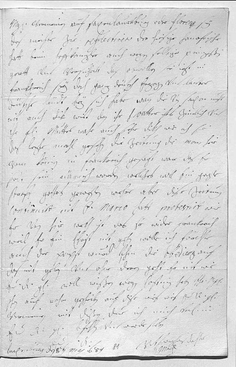 0035Mayestät vermeinen, auf Saxenlawenburg oder Florens sey 0036das meiste zue reflectiren. Der hiesige hanofrische Gesandte 0037hatt beim Hoffkanzler auch wegen selbiger Prinzeßin 0038gerett vnd versichert, das, obwollen sie iezt in 0039Frankhreich sey, doch ganz deütsch erzogen vnd lauter 0040deütsche leüdt bey sich habe. Wan die von Saxen nuhr 0041nit auch dik wirt, dan ihr herr vatter ists zimlich, vnd 0042ihr fraw mutter wahr auch sehr dikh, wie ich sie 0043das lezte mahl gesehn. Die zeitung, die man hier 0044vom König in Frankreich gesagt, war, das er 0045solt sein närrisch worden, welches woll ein große 0046straff gottes geweßen wehre, aber dise zeitung 0047continuirt nit. Pater Marco hatt protestirt, wie 0048er von hier wekh ist, das er wider Frankreich, 0049weil er ein christ ist, nit gehen wolle. Ich förchte 0050auch, der Papst wurd ihm die obedienz auf 0051das nit geben, vnd ohne deren geht er nit, wie 0052ewer Durchlaucht gnädigst woll wißen. Wegen Costniz haben ihr Mayestät 0053schon auf Rohm geschriben, auf dise weis, wies ewer Durchlaucht gnädigst 0054vermeinen. Mit dißen due ich mich vnterdehnigst in 0055ewer Durchlaucht gnade befehlen vnd werde sterben 0056ewer Durchlaucht 0057vnterdehnigste trewgehorsamste dochter 0058EMT 0059Laxenburg den 8ten maij 1689