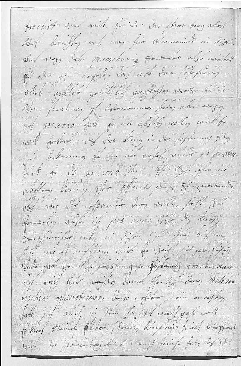 0014tractirt, vnd wirt ewer Durchlaucht der Starenberg alles 0015vnterdehnigst berichten, was man hier vermeindt in disem, 0016vnd wegen des Munschowiz erwarte also weiter 0017ewer Durchlaucht gnädigen befehl. Das mit dem Cuhrfürsten 0018alles gottlob gelükhlich geschloßen, werden ewer Durchlaucht 0019vom Stratman gnädigst vernommen haben, aber wegen 0020des gouerno hatt er nit abstehn wollen, weil er 0021woll erkent, das der König in der hoffnung, erben 0022zue bekommen, es ihm nit abstehn wurde, so preten- 0023dirt er das gouerno, vnd ihr Mayestät haben ihm nit 0024abschlagen können, ihre officia darzu einzuewenden, 0025obs aber die schpanier duen werden, steht zue 0026erwarten. Also ist pro nunc vohr den liebsten 0027Deütschmeister niks in disem zue duen, bis man 0028sicht, wie es auschlagen wirt. Er zeigt sich gahr eifrig 0029vndt hatt ihr Mayestät selbsten gahr inständig gebetten balt 0030ins Reich zue reißen, damit ihr Mayestät denen milita- 0031rischen opperationen desto neheter sein möchten, 0032hatt sich auch in dem haubt werkh gahr woll 0033erklert. Meines eltern herrn brudern könftigen heirat betreffent 0034wirt der Starenberg ewer Durchlaucht auch bericht haben, das ihr