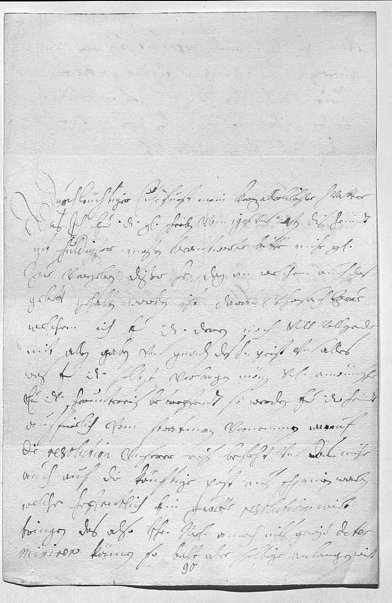 0001Durchleüchtiger Cuhrfürst, mein herzallerliebster herr vatter 0002Das ich ewer Durchlaucht gnädige schreiben vom 19ten vnd 24ten dis heündt 0003nit schuldigster maßen beantworte, bitte mihr gnädigst 0004zue vergeben. Dißer heilige dag, an welchem auch das 0005gebett gehalten worden, ist daran vhrsach, zue 0006welchem ich ewer Durchlaucht deren noch vill vollgende 0007mit allen gaben vnd gnaden des heiligen geist vnd alles, 0008was ewer Durchlaucht selbst verlangen mögen, vnterdehnigst anwüntsche. 0009Ewer Durchlaucht heruntereis betreffendt, so werden ewer Durchlaucht heündt 0010ausfüerlich vom Stratman vernemmen, warauf 0011die resolution vnserer reis besteht, vnd das mihr 0012auch auf die könftige post aus Schpanien warten, 0013welche hoffentlich ein guette resolution wirt 0014bringen, das also ihr Mayestät annoch niks gewiß deter- 0015miniren können. So balt aber selbige anlangen wirt,