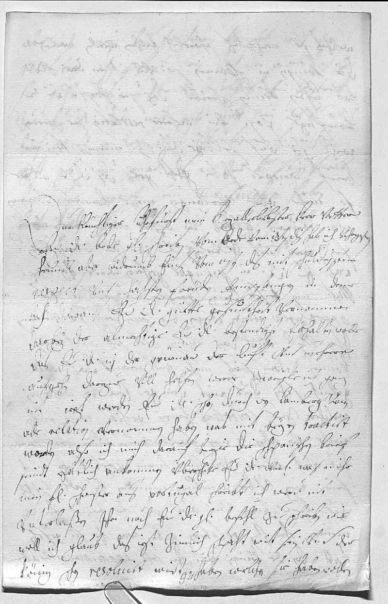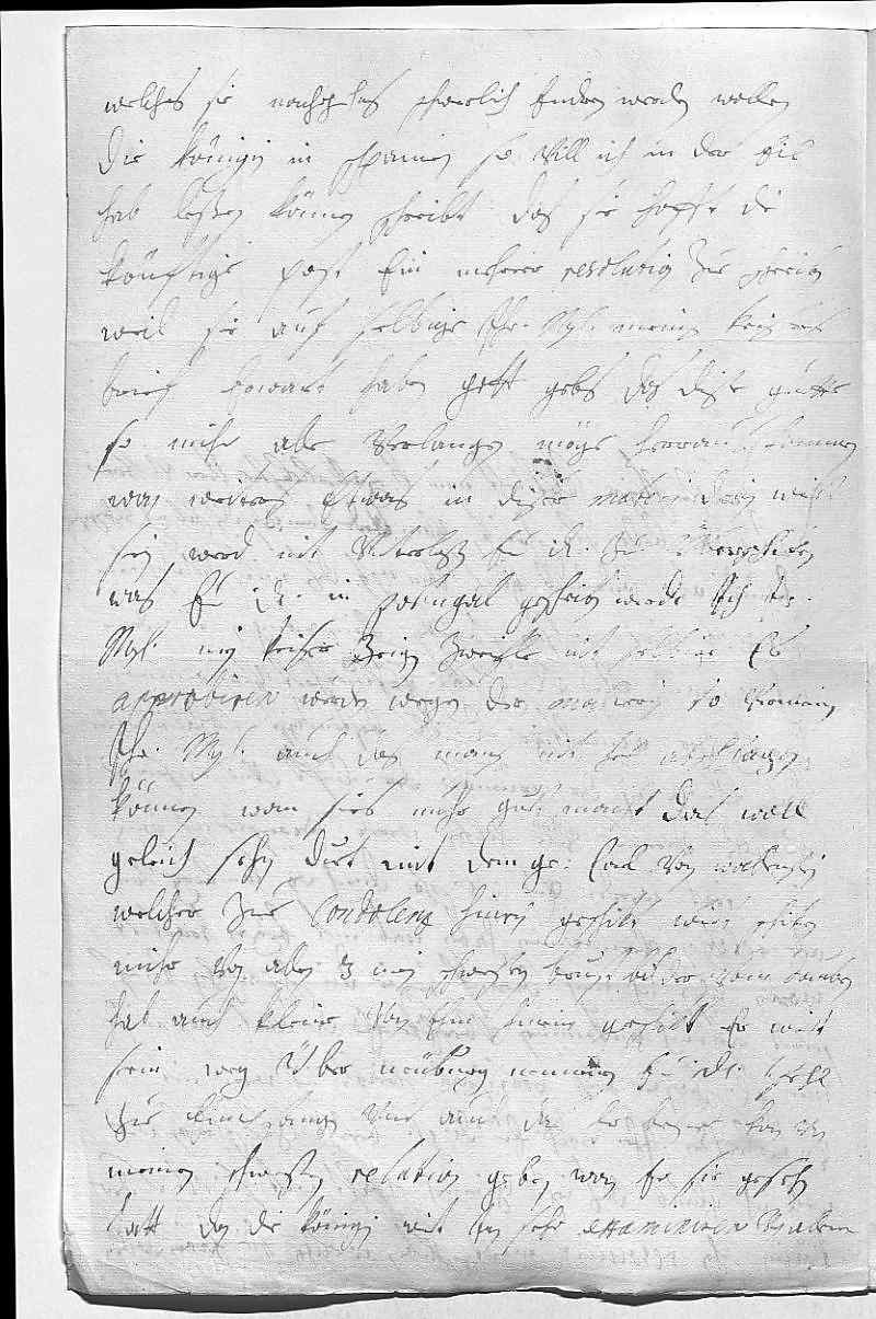 0001Durchleüchtiger Cuhrfürst, mein herzallerliebster herr vatter 0002Ewer Durchlaucht bede gnädige schreiben vom bede vom 13ten dis hab ich vohrgestern, 0003heündt aber widrumb eins vom 17ten dis mit schuldigstem 0004respect vnd höchsten freüden empfangen, in deme 0005ich daraus ewer Durchlaucht güette gesuntheit vernommen, 0006darbey der almechtige ewer Durchlaucht bestendigst erhalten wolle. 0007Das ewer Durchlaucht in der Grünaw der luft vnd mehrern 0008ausgehn darzue vill helfen werde, zweifle ich ganz 0009nit. Iezt werden ewer Durchlaucht schon durch den Lamberg von0010alle relation vernommen haben, was mit Beyren tractirt 0011worden, also ich mich darauf bezie. Die schpanischen brief 0012seindt entlich ankommen, überschike ewer Durchlaucht vnterdehnigst, was mihr 0013mein fraw schwester aus Portugal schreibt. Ich werd nit 0014vnterlaßen, ihr nach ewer Durchlaucht gnädigstem befehl zue schreiben, wie 0015woll ich glaub, das izt zimlich schpaht wirt sein vnd der 0016König schon resoluirt wirt haben, welche sie haben wollen,