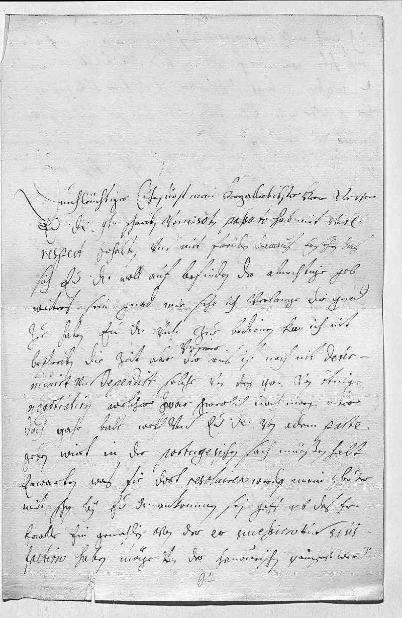 0001Durchleüchtiger Cuhrfürst, mein herzallerliebster herr vatter 0002Ewer Durchlaucht gnädiges schreiben vom 30ten passato hab mit vnterdehnigstem 0003respect erhalten vnd mit freüden daraus ersehen, das 0004sich ewer Durchlaucht woll auf befinden, der almechtige geb 0005weiters sein gnad. Wie sehr ich verlange, die gnad 0006zue haben, ewer Durchlaucht vnterdehnigst zue bedienen, kan ich nit 0007beschreiben. Die zeit aber der vnserer reis ist noch nit deter- 0008minirt, vnd dependirt solche von des Graven von Ötingen 0009negotiation, welcher zwar schwerlich noch morgen, aber 0010doch gahr balt wekh vnd ewer Durchlaucht von allem parte 0011geben wirt. In der portugesischen sach müeßen halt 0012erwarten, was sie dort resoluiren werden. Mein herr bruder 0013wirt schon bey ewer Durchlaucht ankommen sein, gott geb, das er 0014erwelle ein gemahlin, von der er sucession vnd satis- 0015faction haben möge. Von der hanourischen Prinseß werd