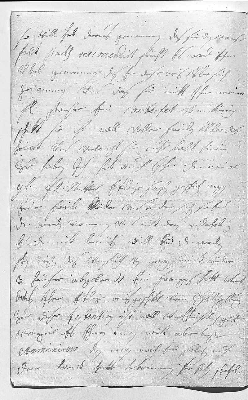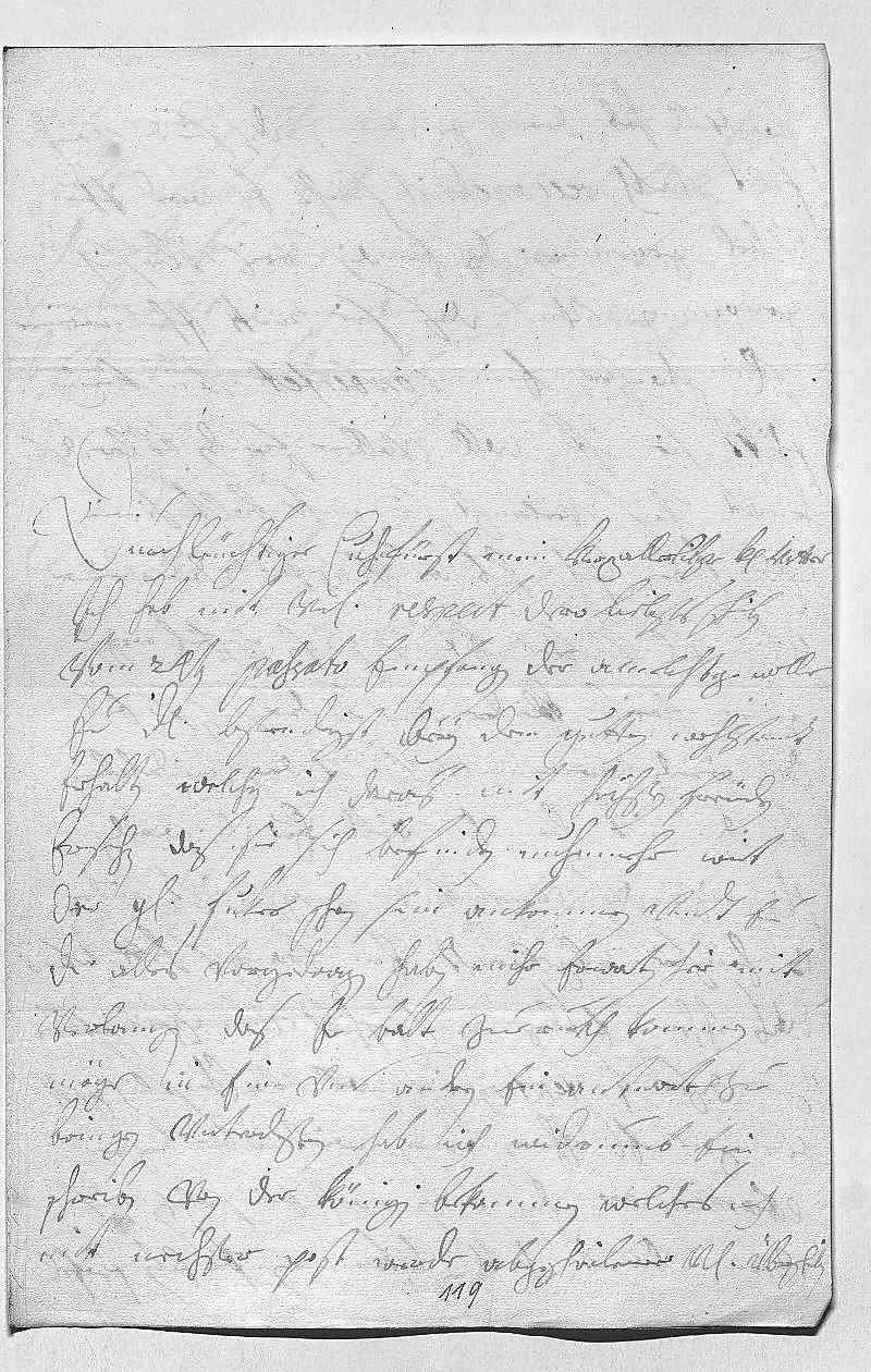 0001Durchleüchtiger Cuhrfürst, mein herzallerlibster herr vatter 0002Ich hab mit vnterdehnigstem respect dero liebsts schreiben 0003vom 24ten passato empfangen, der amelchtige wolle 0004ewer Durchlaucht bestendigst bey dem gutten wohlstandt 0005erhalten, welchen ich daraus mit höchsten freüden 0006ersehen, das sie sich befinden. Nuhnmehr wirt 0007der Grav Fuker schon sein ankommen vndt ewer 0008Durchlaucht alles vorgedragen haben. Mihr erwarten hier mit 0009verlangen, das er balt zuerukh kommen 0010möge, in ein vnd andren ein antwort zue 0011bringen. Vnterdeßen hab ich widerumb ein 0012schreiben von der Königin bekommen, welches ich 0013mit nechster post werde abgeschribener vnterdehnigst überschiken.
