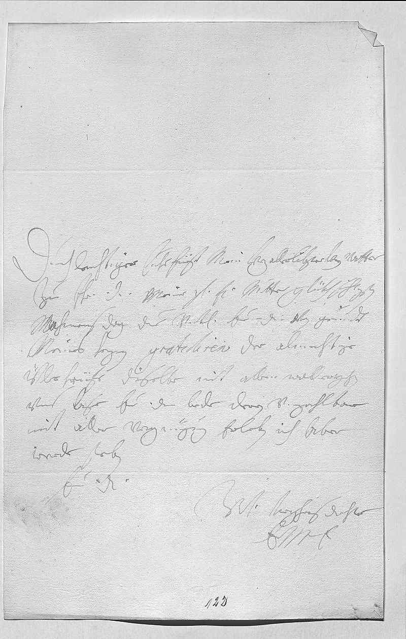 0001Durchleüchtiger Cuhrfürst, mein herzallerlibster herr vatter 0002Zu ihr Durchlaucht, meiner geliebsten fraw mutter, glükhsehligsten 0003nahmens dag due vnterdehnigst ewer Durchlaucht von grundt 0004meines herzen gratuliren. Der almechtige 0005überheüfe diselbe mit allem wollergehen 0006vnd laße ewer Durchlaucht bede deren vnzahlbar 0007mit aller vergnügung erleben. Ich aber 0008werde sterben 0009ewer Durchlaucht 0010vnterdehnigste trewgehorsamste dochter 0011EMT