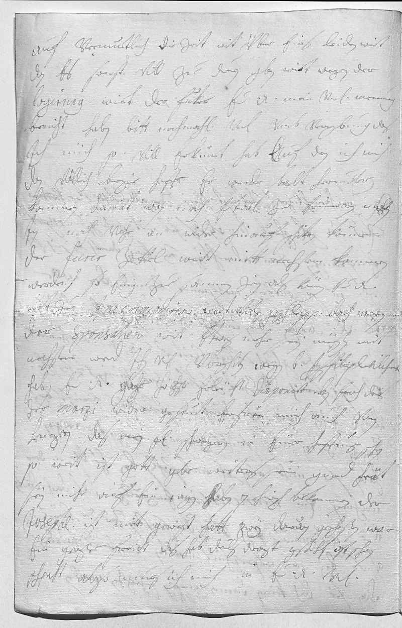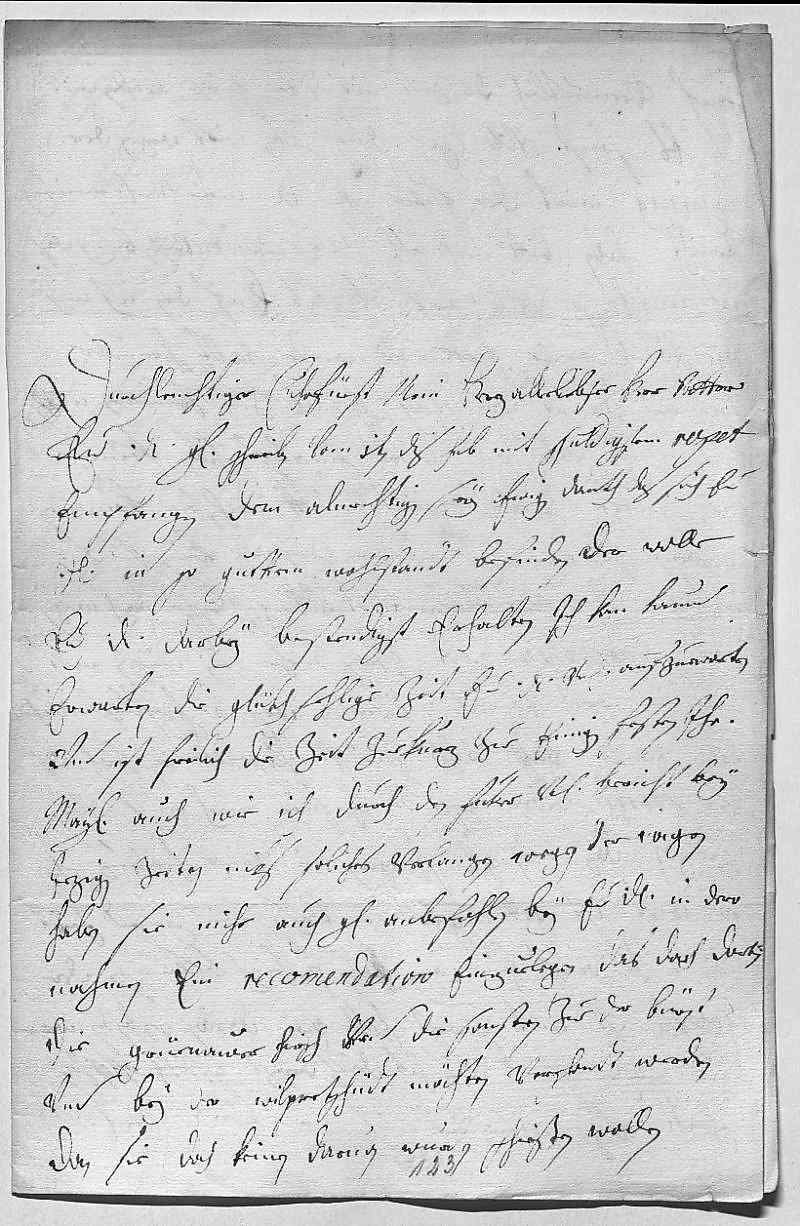 0001Durchleüchtiger Cuhrfürst, mein herzallerliebster herr vatter 0002Ewer Durchaucht gnädiges schreiben vom 1ten dis hab mit schuldigstem respect 0003empfangen. Dem almechtigen sey ewig dankh, das sich ewer 0004Durchlaucht in so guettem wohlstandt befinden, der wolle 0005ewer Durchlaucht darbey bestendigst erhalten. Ich kan kaum 0006erwarten die glükhsehlige zeit, ewer Durchlaucht vnterdehnigst aufzuewarten, 0007vnd ist freilich die zeit zue kurz zue einigen festen, ihr 0008Mayestät auch, wie ich durch den Fuker vnterdehnigst bericht, bey 0009jezigen zeiten niks soliches verlangen. Wegen der iagen 0010haben sie mihr auch gnädigst anbefohlen, bey ewer Durchlaucht in dero 0011nahmen ein recomendation einzuelegen, das doch darbey 0012die grüenawer hirsch vnd die sonsten zue der bürst 0013vnd bey der wilpretschüdt möchten verschondt werden, 0014dan sie doch keinen daruon wurden schießen wollen,