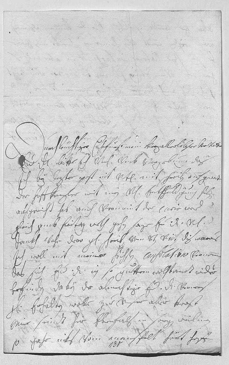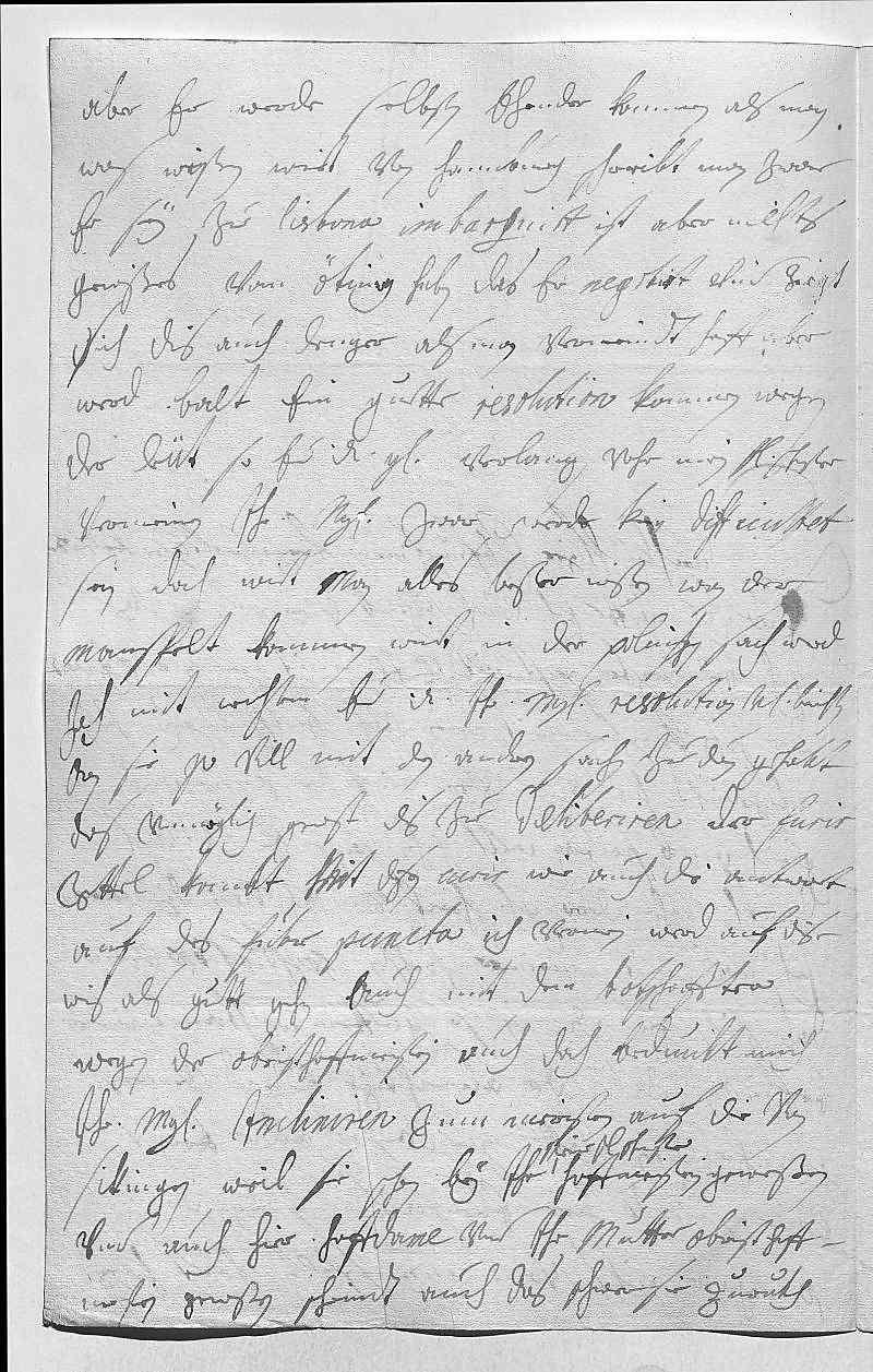 0001Durchleüchtiger Cuhrfürst, mein herzallerliebster her vatter 0002Ewer Durchlaucht bitte ich vnterdehnigst vmb vergebung, das 0003ich bey lezter post nit vnterdehnigst mit schreiben aufgewart. 0004Der Hoffkanzer wirt mein vnterdehnigste entschuldigung haben 0005ausgericht, hab auch vermeint, der curir werd 0006gleich amb freitag wekh gehn. Sage ewer Durchlaucht vnterdehnigsten 0007dankh vohr dero gnädige schreiben vom 8ten vnd 11ten dis, waraus 0008ich woll mit meiner höchsten consolation vernommen, 0009das sich ewer Durchlaucht in so guettem woltandt wider 0010befinden, dabey der almechtige ewer Durchlaucht verners 0011gnädig erhalten wolle zue vnser aller trost. 0012Mir seindt hir ebenfals in sorgen, weil man 0013so gahr niks vom Mansfelt hört, hoff