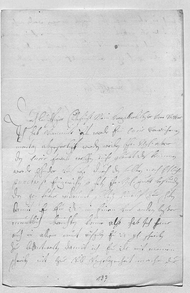 0001Durchleüchtiger Cuhrfürst, mein herzallerliebster herr vatter 0002Ich hab vermeint, es werde ein curir verwichenen 0003montag abgefertigt werden, weilen ihr Mayestät aber 0004den curir erwart, welchen mihr glaubt, das kommen 0005werde ehnder, vnd izt durch den selben noch etlich 0006puncta, so einzurichten, so haben ihr Mayestät gutt befunden, 0007den Grav Fuker widerumb selbsten hinauf zue schiken, 0008damit er ewer Durchlaucht in einem vnd andren beßer 0009müntlich berichten könne. Also hab ich ime 0010auch in allem müntlich aufgeben, ewer Durchlaucht gnädiges schreiben 0011zue beantworten. Damit ich ewer Durchlaucht mit meinem 0012schreiben nit zue vill vngelegenheit mache, due