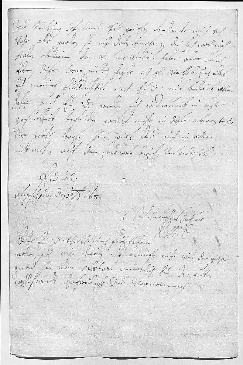0015zue Neüburg disen trost zue genießen. Bedanke mich vnterdehnigst 0016vohr alle gnaden, so mihr dorten empfangen, die ich woll nieh- 0017malen abdienen kan vnd nie verdient habe, aber durch 0018eben dise dero gütte hoffe ich gnädige vergebung, das 0019ich meiner schuldichkeit nach ewer Durchlaucht nit bedient. Ver- 0020hoffe auch, ewer Durchlaucht werden sich widerumb in bester 0021gesuntheit befinden, welches mihr in diser abweßenheit 0022der gröste trost sein wirt. Due mich in allem 0023mitt mehren auf den Colebrat beziehen vnd werde sterben 0024ewer Durchlaucht 0025vnterdehnigste trewgehorsamste dochter 0026EMT 0027Augschpurg den 1 septembris 16890028Bitte ewer Durchlaucht vnterdehnigst vnd fueßfallent, 0029sie wollen sich mit schreiben nit bemüehen, mihr wirt die groste 0030gnad sein, vom Colobrat müntlich ewer Durchlaucht gutten 0031wohlstandt erfreüligst zue vernemmen.