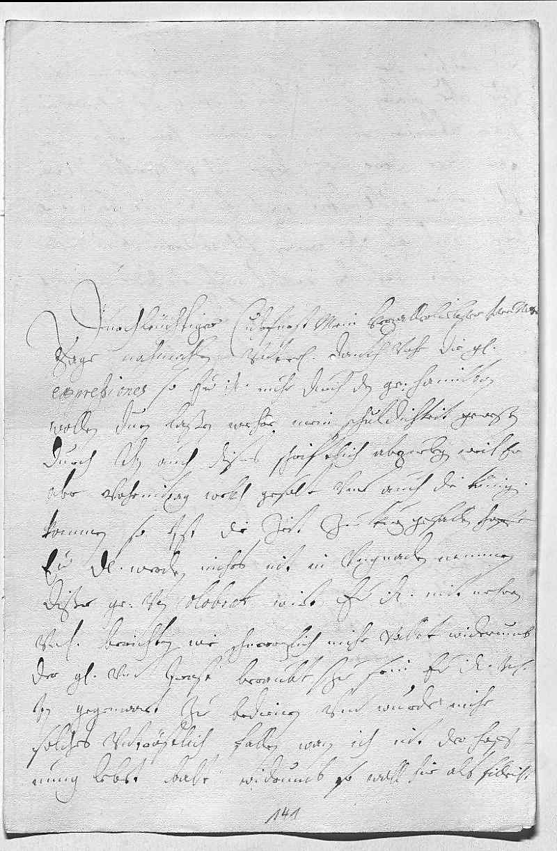0001Durchleüchtiger Curfürst, mein herzallerliebster her vatter 0002Sage nachmahlen vnterdehnigst dankh vohr die gnädige 0003expressiones, so ewer Durchlaucht mihr durch den Graven Hamilton 0004wollen duen laßen. Wehre mein schuldichkeit geweßen, 0005durch ihn auch dises schriftlich abzuelegen, weil er 0006aber vohrmitag wekh gesolt vnd auch die Königin 0007kommen, so ist die zeit zu kurz gefallen, hoffe, 0008ewer Durchlaucht werden mihrs nit in vngnaden nemmen. 0009Dißer Grav von Colobrat wirt ewer Durchlaucht mit nehren 0010vnterdehnigst berichten, wie schmerzlich mihr vallet, widerumb 0011der gnade vnd trost beraubt zue sein, ewer Durchlaucht vnterdehnigst 0012in gegenwart zue bedienen. Vnd wurde mihr 0013solches vntröstlich fallen, wan ich nit der hoff- 0014nung lebet, balt widrumb so woll hir als filleicht