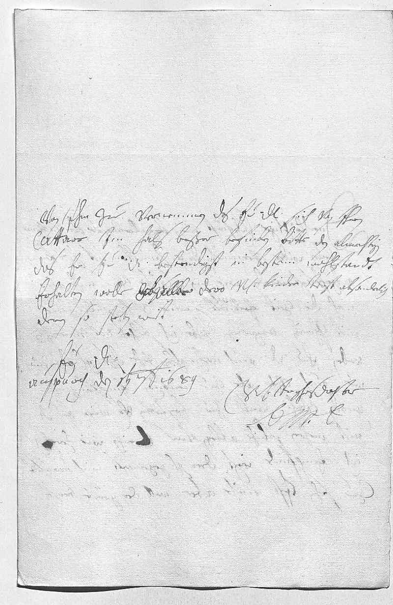 0012von ihm zue vernemmen, das ewer Durchlaucht sich von ihren 0013cattarr im hals beßer befinden. Bitte den almechtigen, 0014das er ewer Durchlaucht bestendigst in bestem wohlstandt 0015erhalten wolle zue aller dero vnterdehnigsten kinder trost, absonderlich 0016deren, so sterben wirt 0017ewer Durchlaucht 0018vnterdehnigste trewgehorsamste dochter 0019EMT 0020Auspurch den 1ten septembris 1689