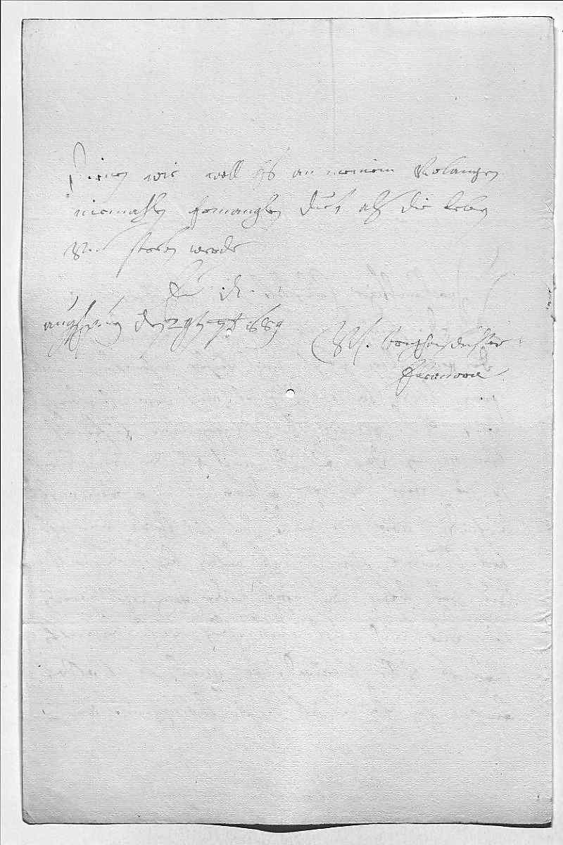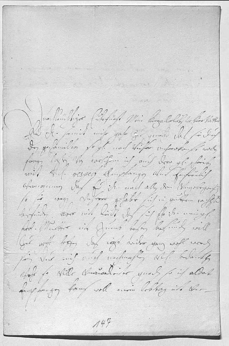 0001Durchleüchtiger Curfürst, mein herzallerliebster herr vatter 0002Ewer Durchlaucht seindt mihr gahr zue gnedig, das sie durch 0003den Graven Hamilton so gnädig nach vnser anherokunft wollen 0004fragen laßen, von welchem ich auch dero gnädiges schreiben 0005mit vnterdehnigstem respect empfangen vnd erfreülich 0006vernommen, das ewer Durchlaucht nach allen den vngelegenheiten, 0007so sie wegen vnserer gehabt, sich in guettem wohlstand 0008befinden, aber mit leidt, das sich ihr Durchlaucht, mein geliebste 0009fraw muetter, nit zumb besten befunden, will 0010zue gott hoffen, das iezt wider ganz wohl werden 0011sein. Due mich auch nochmahlen vnterdehnigst bedankhen 0012vohr so ville vnuerdiente gnaden, so ich aldort 0013empfangen, kans woll mein lebtag nit ver-