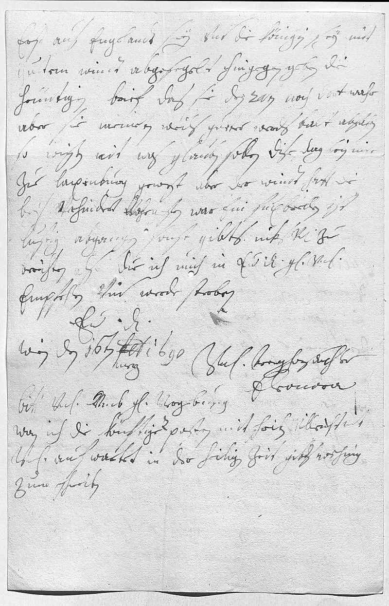 0001Durchleüchtiger Cuhrfürst, mein herzallerlibster herr vatter 0002Ewer Durchlaucht gnädiges schreiben vom 10ten dis hab mit vnterdehnigstem res- 0003pect empfangen, der almechtige erhalte ewer Durchlaucht 0004verners bey bestendiger gesundtheit. Die brief 0005in Schpanien werd fleisig überschiken, aber den 0006üDetschmeister, glaub ich, werds nimmer antreffen. 0007Ich wills aber vnserer Königin einschließen, das, 0008wan er schon wekh wehr, sies ihm nachschiken könte, 0009dan ich nit weis, was er noch vohr ein weg wirt 0010zuerukh nemmen. Der Herzoch von Lottring hatt zwar 0011vom 8ten von Inschprukh geschriben, das dorten ein 0012engelendischer cavalier durch auf Venedig, welchen der 0013König Wilhelm gahr in Türkey schikt, sie zum friden 0014zue persuadiren. Der hab gesagt, das er erst 11 dag