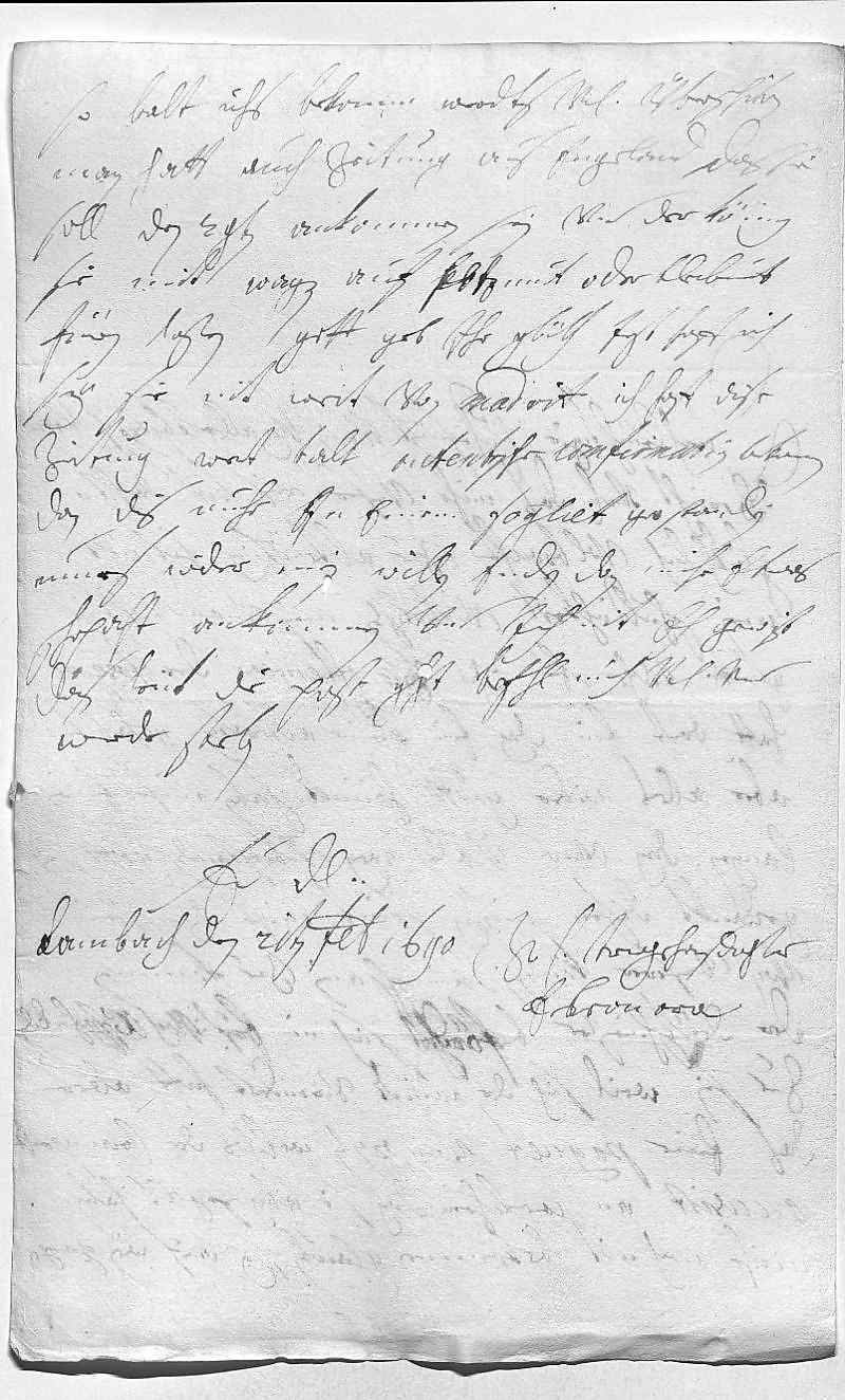 0016So balt ichs bekomm, werdts vnterdehnigst überschiken. 0017Man hatt auch zeitung aus Engeland, das sie 0018soll den 29ten ankommen sei vnd der König 0019sie mit wagen auf Potzmut oder Bleibmut 0020füren laßen, gott geb ihr glükh. Jezt hoff ich, 0021sey sie nit weit von Madrit . Ich hoff, dise 0022zeitung wert balt autentische comfirmation bekomen, 0023dan dis nuhr in einem fogliet gestanden. 0024Mues wider mein willen enden, dan mihr etwas 0025schpaht ankommen vnd ich nit eh gewist, 0026das heüt die post geht. Befehl mich vnterdehnigst vnd 0027werde sterben 0028ewer Durchlaucht 0029vnterdehnigste trewgehorsamste dochter 0030Eleonora 0031Lambach den 21ten februarij 1690