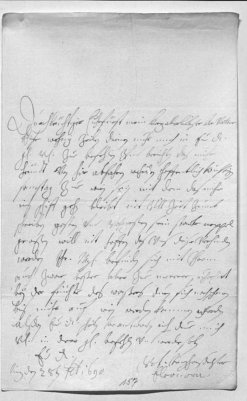 0001Durchleüchtiger Cuhrfürst, mein herzallerliebster her vatter 0002Dise wehnig zeilen dienen nuhr, mich in ewer Durchlaucht 0003gnade vnterdehnigst zue befehlen vnd zu berichten, das mihr 0004heündt von hir abfahren, wehrden hoffentlich könftigen 0005samstag zue Wien sein. Mit dem, das mihr 0006ins schiff gehen, bleibt nit vill zeit zumb 0007schreiben. Gestren vnd vohrgestren sein starke neppel 0008geweßen, will nit hoffen, das vns dise verhindren 0009werden. Ihr Mayestät befinden sich mit ihrem fluss0010auch zwar beßer, aber zue mererer sicherheit 0011bey der feüchte des waßers duen sich noch schonen, 0012bis mihr auf Wien werden kommen, werden 0013alsdan ewer Durchlaucht schreiben beantworten. Ich due mich 0014vnterdehnigst in dero gnade befehlen vnd werde sterben 0015ewer Durchlaucht 0016vnterdehnigst trewgehorsamste dochter 0017Eleonora 0018Linz den 28ten februarij 1690