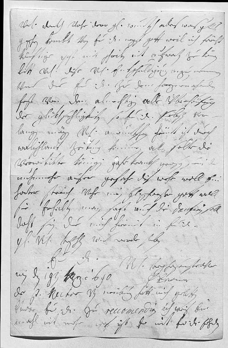 0017vnterdehnigst dankh vohr dero gnädigen wuntsch, alles, was gutts 0018geschen, kombt von ewer Durchlaucht negst gott. Weil ich förcht, 0019könftige post mit schreiben nit aufwarten zu könen, 0020bitt vnterdehnigst, dise vnterdehnigste entschuldigung anzuenemmen, 0021vnd due ewer Durchlaucht zue dem herzuenahenden 0022fest von dem almechtigen alle überheüfung 0023der glükhsehligkeiten, so ewer Durchlaucht selbsten ver- 0024langen mögen, vnterdehnigst anwüntschen. Heünt ist durch 0025Walischlandt zeitung kommen, als solte die 0026verwitibte Königin gahr krankh gewesen sein, doch0027nuhnmehr auser gefahr. Dis wehr woll ein 0028harter streich vohr mein fraw schwester, gott woll 0029sie erhalten. Man sagt auch, die Daufien soll 0030doht sein. Due mich hiermit in ewer Durchlaucht 0031gnade vnterdehnigst befehlen vnd werde sterben 0032ewer Durchlaucht 0033vnterdehnigste trewgehorsamste dochter 0034Eleonora 0035Wien den 19ten merz 16900036Der Pater Rector von Neüburg hatt mich gebetten, 0037etwa ewer Durchlaucht zu reccomendiren, ich weis ein- 0038mahl nit mehr was, ist er nit ewer Durchlaucht fehden.