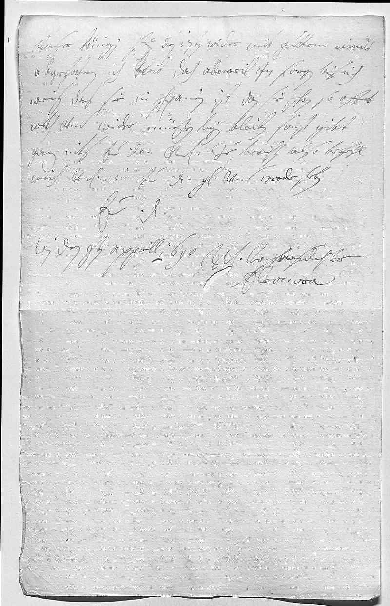 0016vnser Königin sey den 17ten wider mit guttem windt 0017abgefahren. Ich bleib doch alleweil in sorgen, bis ich 0018weis, das sie in Schpanien ist, dan sie schon so offt 0019wekh vnd wider müeßen ligen bleiben. Sonst gibt 0020ganz niks ewer Durchlaucht vnderdehnigst zu berichten, also befehl 0021mich vnterdehnigst in ewer Durchlaucht gnade vnd werde sterben 0022ewer Durchlaucht 0023vnterdehnigste trewgehorsamste dochter 0024Eleonora 0025Wien den 9ten apprill 1690
