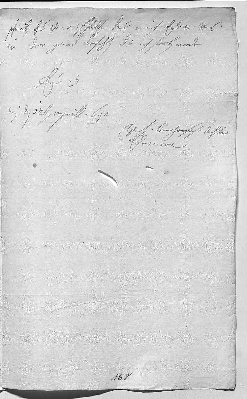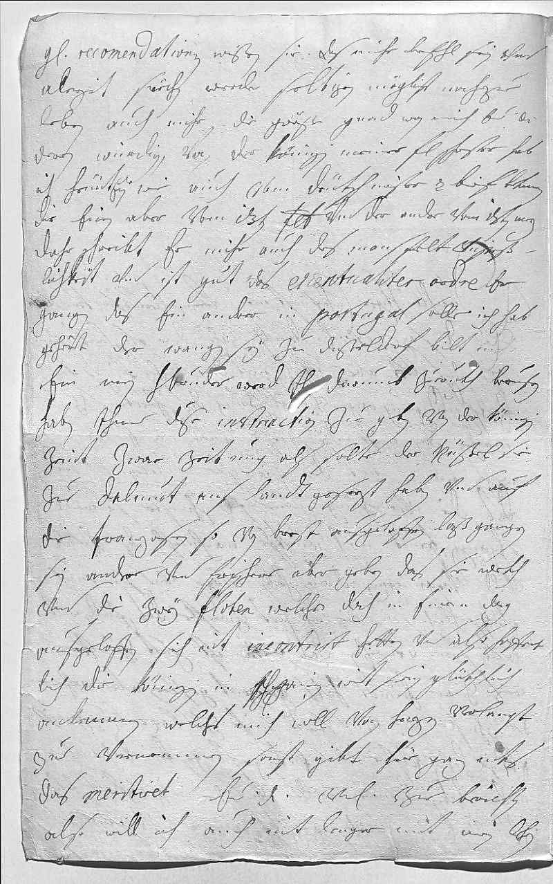 0017gnädigste recomendationen wißen sie, das mihr befehl sein vnd 0018ich allezeit süechen werde, selbigen möglist nachzue- 0019leben, auch mihr die gröste gnad, wan mich ewer Durchlaucht 0020deren würdigen. Von der Königin, meiner fraw schwester, hab 0021ich heünt ein, wie auch vom Deütschmeister 2 brif bekomen, 0022die einen aber vom 13ten februarij vnd der andre vom 13ten merz. 0023Dahr schreibt er mihr auch des Mansfelt vnpeß- 0024lichkeit vnd ist gut, das euentualiter ordre er- 0025gangen, das ein andrer in Portugal solle. Ich hab 0026gehört, der Wangen sey zu Düßeldorf, bilt mihr 0027ein, mein herr bruder werd ihn darumb zurukh berufen 0028haben, ihme dise instruction zue geben. Von der Königin 0029zeint zwar zeitung, als solte der Küßel sie 0030zue Dalmut ans landt gesezt haben vnd auf 0031die franzosen, so von Brest ausgeloffen, loßgangen 0032sein, andere vnd frischere aber geben, das sie wekh 0033vnd die zwey floten, welche doch in einem dag 0034ausgeloffen, sich nit incontrirt hetten vnd also hoffent- 0035lich die Königin in Schpanien wirt sein glükhlich 0036ankommen, welchs mich woll von herzen verlangt 0037zue vernemmen. Sonst gibt hier ganz niks, 0038das mertiret, ewer Durchlaucht vnterdehnigst zue berichten, 0039also will ich auch nit lenger mit mein lehren