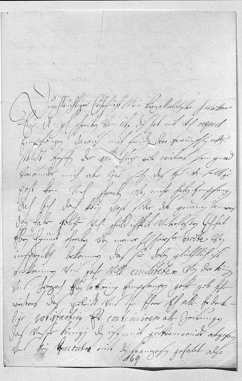 0001Durchleüchtiger Cuhrürst, mein herzallerliebster herr vatter 0002Ewer Durchlaucht gnädiges schreiben vom 11ten dis hab mit vnterdehnigstem respect 0003empfangen, daraus mit freüden dero erwünschten wohl- 0004standt ersehen, der almechtige gebe weiters sein gnad. 0005Verwunder mich aber zue sehen, das ewer Durchlaucht selbige 0006post kein vnterdehnigstes schreiben von mihr haben empfangen, 0007dah ich doch kein post sider des grüenen donners- 0008dag habe solche vnterdehnigste schuldichkeit vnterlaßen. Ich hab 0009eben heündt schreiben von meiner fraw schwester Dorote von 0010Insprukh bekommen, das sie dorten glükhlich ist 0011ankommen vnd gahr vill ciuiliteten von der Königin 0012vnd Herzoch von Lottring empfangen, gott geb ihr 0013weiters das geleidt vnd in ihrer eh alle erdenk- 0014lige satisfaction. Es continuiren alle zeitungen, 0015das vnser Königin den 17ten mit guttem windt abgefaren 0016vnd kein incontra mit den franzosen gehabt, also