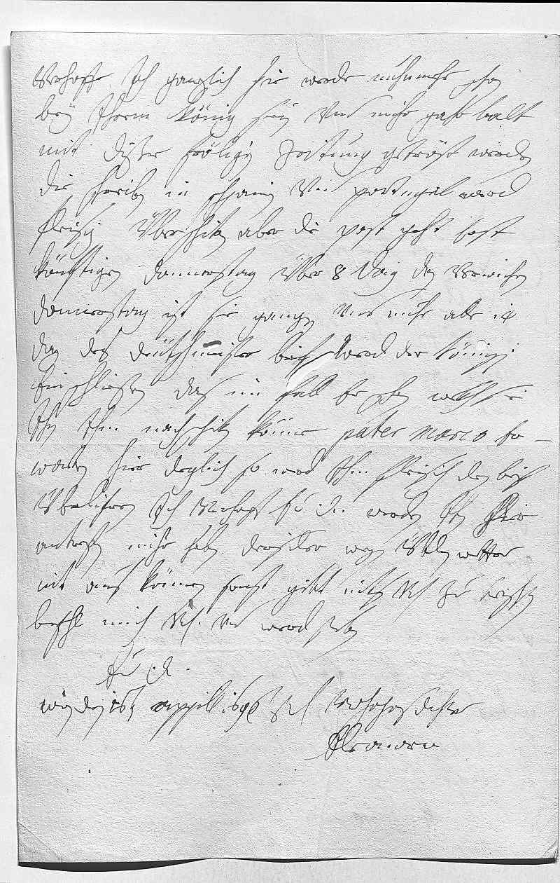 0017verhoffe ich ganzlich, sie werde nuhnmehr schon 0018bey ihrem König sein vnd mihr gahr balt 0019mit dißer fröligen zeitung getröst werden. 0020Die schreiben in Schpanien vnd Portugal werd 0021fleisig überschiken, aber die post geht erst 0022könftigen donnerstag über 8 dag, den verwichen 0023donnerstag ist sie gangen vnd geht nuhr alle 14 0024dag. Des Deütschmeister brif werd der Königin 0025einschließen, das, im fall er schon wekh sei, sie0026ihn ihm nachschiken könne. Pater Marco er- 0027warten wir hier deglich, so werd ihm fleisich den brif 0028überlifren, ich verhoff, ewer Durchlaucht werden ihn hier 0029antrefen. Mihr haben dersider wegen üblen wetter 0030nit aus können, sonst gibt niks vnterdehnigst zu berischten, 0031befehl mich vnterdehnigst vnd werd sterben 0032ewer Durchlaucht 0033vnterdehnigste trewgehorsamste dochter 0034Eleonora 0035Wien den 16ten apprill 1690