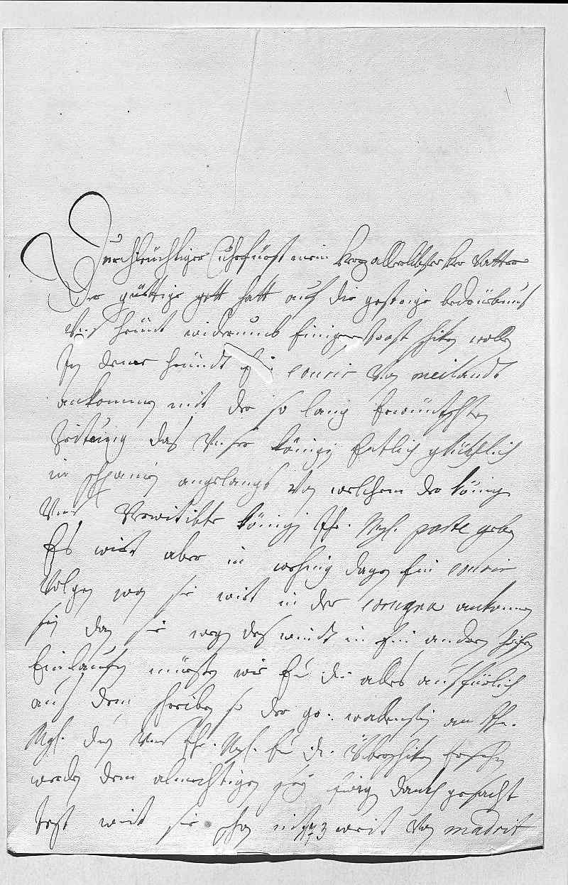 0001Durchleüchtiger Cuhrfürst, mein herzallerlibster her vatter 0002Der güttige gott hatt auf die gestrige bedrüebnus 0003vns heünt widerumb einigen trost schiken wollen, 0004in deme heündt ein courir von Meilandt 0005ankommen mit der so lang erwüntschten 0006zeitung, das vnser Königin entlich glükhlich 0007in Schpanien angelangt, von welchem der König 0008vnd verwitibte Königin ihr Mayestät parte geben. 0009Es wirt aber in wehnig dagen ein courir 0010volgen, wan sie wirt in der Corugna ankommen 0011sein, dan sie wegen des windt in ein andren hafen 0012einlaufen müeßen, wie ewer Durchlaucht alles ausfürlich 0013aus dem schreiben, so der Grav Wallenstein an ihr 0014Mayestät duen vnd ihr Mayestät ewer Durchlaucht überschiken, ersehen 0015werden, dem almechtigen sey ewigen dankh gesacht. 0016Jezt wirt sie schon nit weit von Madrit