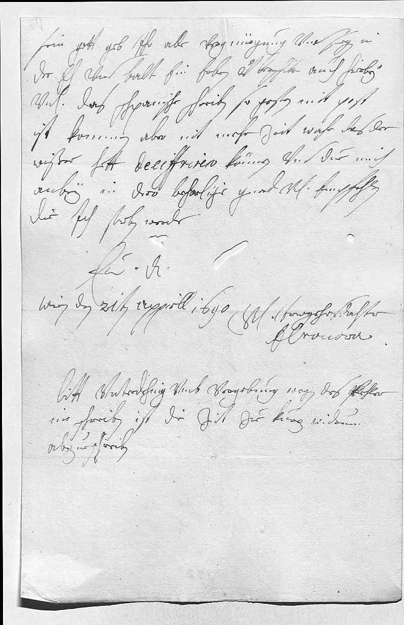 0017sein, gott geb ihr alle vergnüegung vnd segen in 0018der eh vnd balt ein erben. Überschike auch hierbey 0019vnterdehnigst das schpanische schreiben, so gestren mit post 0020ist kommen, aber nit mehr zeit wahr, das der 0021Wißer hett deciffriren können, vnd due mich 0022anbey in dero beharlige gnad vnterdehnigst empfehlen, 0023die ich sterben werde 0024ewer Durchlaucht 0025vnterdehnigste trewgehorsamste dochter 0026Eleonora 0027Wien den 21ten apprill 16900028Bitt vnterdehnig vmb vergebung wegen des fehler0029im schreiben, ist die zeit zue kurz, widrum 0030abzueschreiben.