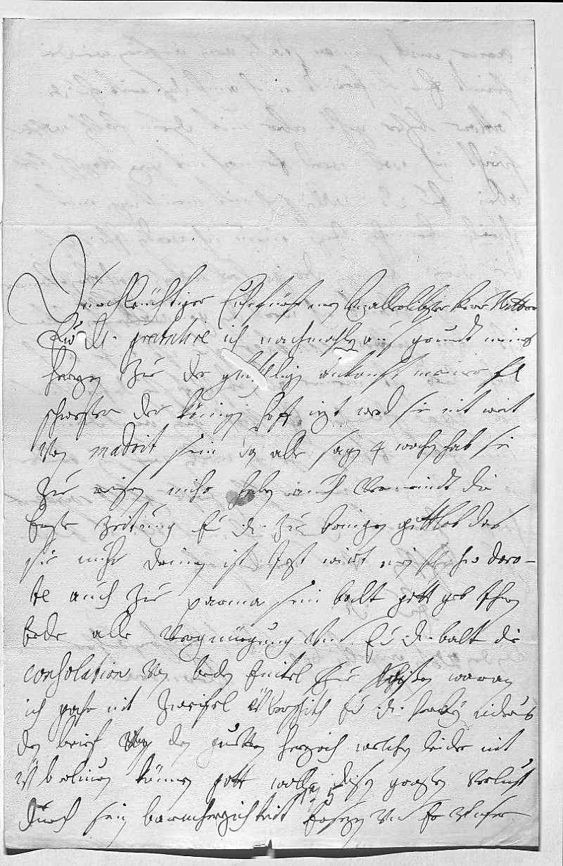 0001Durchleüchtiger Cuhrfürst, mein herzallerlibster herr vatter 0002Ewer Durchlaucht gratulire ich nachmahlen aus grundt meines 0003herzen zue der glükhligen ankonft meiner fraw 0004schwester, der Königin . Hoff, izt werd sie nit weit 0005von Madrit sein, dan alle sagen, 4 wochen hab sie 0006zue reisen. Mihr haben auch vermeindt, die 0007erste zeitung ewer Durchlaucht zu bringen, gottlob, das 0008sie nuhr drinen ist. Jezt wirt mein fraw schwester Doro- 0009te auch zue Parma sein balt, gott geb ihnen 0010bede alle vergnüegung vnd ewer Durchlaucht balt die 0011consolation, von beden einikel zue wißen, waran 0012ich gahr nit zweifel. Überschikh ewer Durchlaucht herbey widerumb 0013den brief an den guetten Herzoch, welchen leider nit 0014überliuren können, gott woll disen großen verlust 0015durch sein barmherzichkeit ersezen vnd er vnser