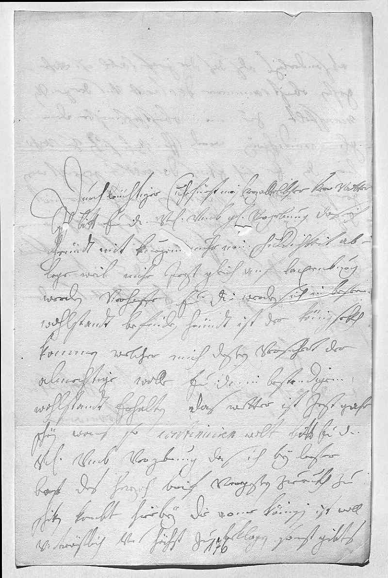 0001Durchleüchtiger Cuhrfürst, mein herzallerlibster herr vatter 0002Ich bitt ewer Durchlaucht vnterdehnigst vmb gnädige vergebung, das ich 0003heündt mit kurzem nuhr mein schuldichkeit ab- 0004lege, weil mihr jezt gleich auf Laxenburg gehen0005werden. Verhoffe, ewer Durchlaucht werden sich in bestem 0006wohlstandt befinden. Heündt ist der Königsekh 0007kommen, welcher mich deßen versichert, der 0008almechtige wolle ewer Durchlaucht in bestendigem 0009wohlstandt erhalten. Das wetter ist jezt gahr 0010schön, wans so continuiren wolt. Bitt ewer Durchlaucht 0011vnterdehnigst vmb vergebung, das ich bey lezter 0012post des Herzoch brif vergeßen zuerukh zu 0013schiken, kombt hierbey. Die arme Königin ist woll 0014vntröstlich vnd höchst zu beklagen. Sonst gibts