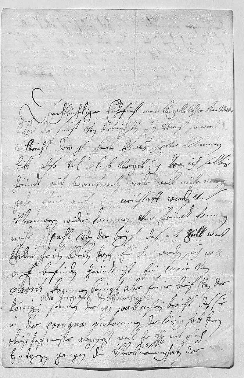 0001Durchleüchtiger Cuhrfürst, mein herzallerlibster herr vatter 0002Weil der Fürst von Dietrichsten schon vereist, so werd 0003villeicht dero gnädige schreiben etwas schpeter bekommen. 0004Bitt also vnterdehnigst vmb vergebung, wan ich selbige 0005heündt nit beantworten werde, weil mihr morgen 0006gahr früe auf die Neüstatt werden vnd 0007übermorgen wider kommen, vnd heündt kommen 0008mihr schpaht von der beys, das nit zeit wirt 0009zum schreiben bleiben. Hoff, ewer Durchlaucht werden sich woll 0010auf befinden. Heündt ist ein curir von 0011Madrit rs> kommen, bringt aber keine brif von der 0012Königin oder iemant von ihrer suite, sondern der Grav Wallenstein bericht, das sie 0013in der Corugna ankommen sind. Der König hatt iren 0014Obrist Hoffmeister abgesezt, weil er ihr nit gleich 0015entgegen gangen. Die überliverung haben der