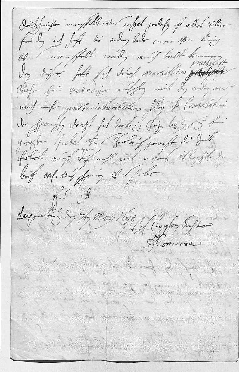 0016Deütschmeister, Mansfelt vnd Russel gedahn, ist alles voller 0017freüden. Ich hoff, die andren bede curir vom König 0018vnd Mansfelt werden auch balt kommen, 0019dan diser hatt sich durch Marsillien practicirt practicirt0020und vohr ein venediger ausgeben, mit den andern werds 0021noch mehr particulariteten haben. Ihr conterfet in 0022der schpanischen dracht hat der Kenig zeigen laßen, sey ein 0023großer iubel vnd zuelauf geweßt. Die zeit 0024erleit auf dismahl nit mehrers, überschik den 0025brif vnterdehnigst aus Schpanien vnd sterbe 0026ewer Durchlaucht 0027vnterdehnigste trewgehorsamste dochter 0028Eleonora 0029Laxenburg den 7ten maij 1690
