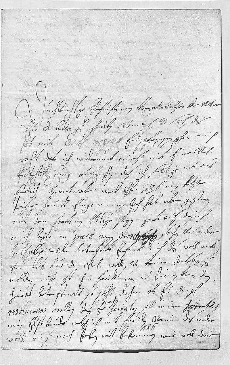 0001Durchleüchtige Cuhrfürstin, mein herzallerliebster her vatter 0002Ewer Durchlaucht bede gnädige schreiben vom 2ten vnd 5ten dis0003hab mit vnterdehnigstem respect empfangen. Scheme mich 0004recht, das ich widerumb mueß mit einer vnterdehnigsten 0005entschuldigung aufziehen, das ich selbige nit aus- 0006fürlich beantworte, weil ihr Mayestät, mein liebster 0007Keiser, heündt eingenommen. Ich hab aber gestren 0008mit dem Stratman etlige sagen geret, auf den ich 0009mich bezie, in specie wegen der polnischen sachen vnd andre 0010bruder Pfilip Wilhelm betrefent. Erfeüdt mich, das sie woll ankomen sind, 0011vnd bitt ewer Durchlaucht vnterdehnigst, sie wollen von keiner danksagng 0012melden, mihr ist ein freüdt, wan ich dienen kann. Den 0013heirat betreffendt, so steht dahin, ob ewer Durchlaucht gnädig 0014resoluiren wollen, das er noch heiraten soll, in dem hoffentlich 0015mein elster bruder, von welchen ich mit freüden vernim, das wider 0016woll auf, noch erben wirt bekommen, wie woll der