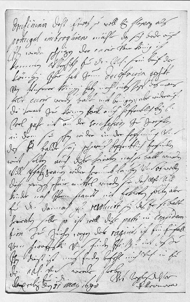 0017Daufinina doht etwas so woll bey Florenz als 0018Portugal imbrogliren möchte, dan sich bede auf 0019ihn werden schpizen. Der curir vom König ist 0020kommen, überschikh ewer Durchlaucht vnterdehnigst sein brif. Der 0021Königin ihre hab zum deciffririen geschikt. 0022Von vnserer Königin haben noch niks, hoff, des Mans- 0023felt curir werds balt mit bringen). Aber wider auf 0024die heirat zue kommen, weil auch hoffentlich bey bruder 0025Carl gahr nit an der sucsession zu zweiflen, 0026in dem sie schon wider in der hoffnung vnd 0027des Pater Balde sein schpruch sich hoffentlich erfüllen 0028wirt, solten auch diser heiraten noch so balt, wurden 0029vill pfalzgrauen wider herumb laufen, vnd ob wollen 0030diese Prinzes schöne mittel hätte, wurden sie doch vohr vill 0031kinder nach ihrem standt nit erkleken. Solten aber 0032ewer Durchlaucht dannoch gnädigst resoluirt sein, das er so balt 0033heiraten solle, so ist woll dise parti in considera- 0034tion zue ziehen. Wegen des Ragiuil, ist ein einfall 0035vom Schiroffski, vnd finden ihr Mayestät nit, das zu 0036ihrn dienst ist. Mus enden, befehl mich vnterdehnigst in ewer 0037Durchlaucht gnade vnterdehnigst vnd werde sterben 0038ewer Durchlaucht 0039vnterdehnigste trewgehorsamste dochter 0040Eleonora 0041Laxenburg den 11 maij 1690