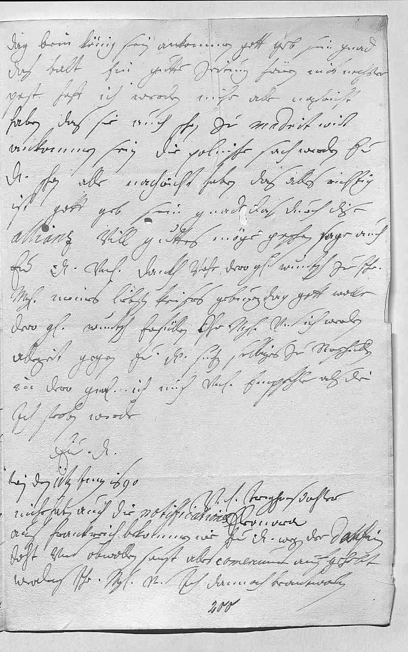 0039dag beim König sein ankommen, gott geb sein gnad, 0040das balt ein gutte zeitung hören. Mit nechster 0041post, hoff ich, werden mihr alle nachricht 0042haben, das sie auch schon zu Madrit wirt 0043ankommen sein. Die polnische sach werden ewer 0044Durchlaucht schon alle nachricht haben, das alles richtig 0045ist, gott geb sein gnad, das durch dise 0046allianz vill guttes möge geschen. Sage auch 0047ewer Durchlaucht vnterdehnigsten dankh vohr dero gnädigen wuntsch zue ihr 0048Mayestät, meines liebsten Keisers, geburzdag, gott wolle 0049dero gnädigen wuntsch erfüllen. Ihr Mayestät vnd ich werden 0050allzeit gegen ewer Durchlaucht suchen, selbiges zu verschulden, 0051in dero gnad ich mich vnterdehnigst empfehle, als die 0052ich sterben werde 0053ewer Durchlaucht 0054vnterdehnigste trewgehorsamste dochter 0055Eleonora 0056Wien den 11ten junij 16900057Mihr haben auch die notifficationes 0058aus Frankreich bekommen, wie ewer Durchlaucht, wegen der Daufinin 0059doht, vnd obwollen sonst alles comercium aufgehebt, 0060werdens ihr Mayestät vnd ich dannoch beantworten.