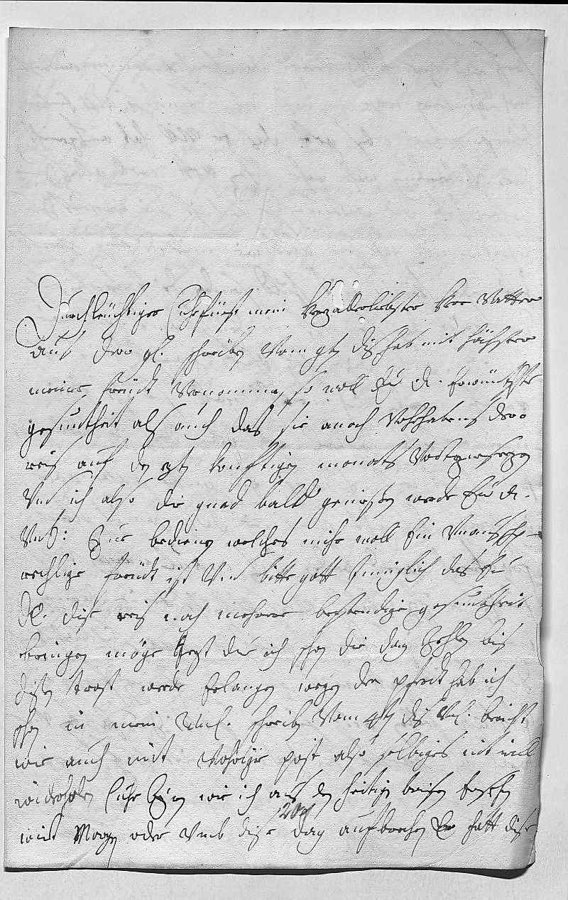 0001Durchleüchtiger Cuhrfürst, mein herzallerliebster herr vatter 0002Aus dero gnädigem schreiben vom 9ten dis hab mit höchster 0003meiner freüdt vernommen so woll ewer Durchlaucht erwüntschte 0004gesuntheit als auch, das sie anoch vohrhabens, dero 0005reis auf den 3ten konftigen monats vortzuesezen 0006vnd ich also die gnad bald genießen werde, ewer Durchlaucht 0007vnterdehnigst zue bedienen, welches mihr woll ein vnausschp- 0008rechlige freüdt ist, vnd bitte gott inniglich, das ewer 0009Durchlaucht dise reis noch mehrere bestendige gesuntheit 0010bringen möge. Jezt due ich schon die dag zehlen, bis ich0011dißen trost werde erlangen. Wegen der pferdt hab ich 0012schon in mein vnterdehnigsten schreiben vom 4ten dis vnterdehnigst bericht, 0013wie auch mit vohriger post, also selbiges nit will 0014widerholen. Cuhr Beyren, wie ich aus den heitigen brifen ersehen, 0015wirt morgen oder vmb dise dag aufbrechen. Er hatt dise