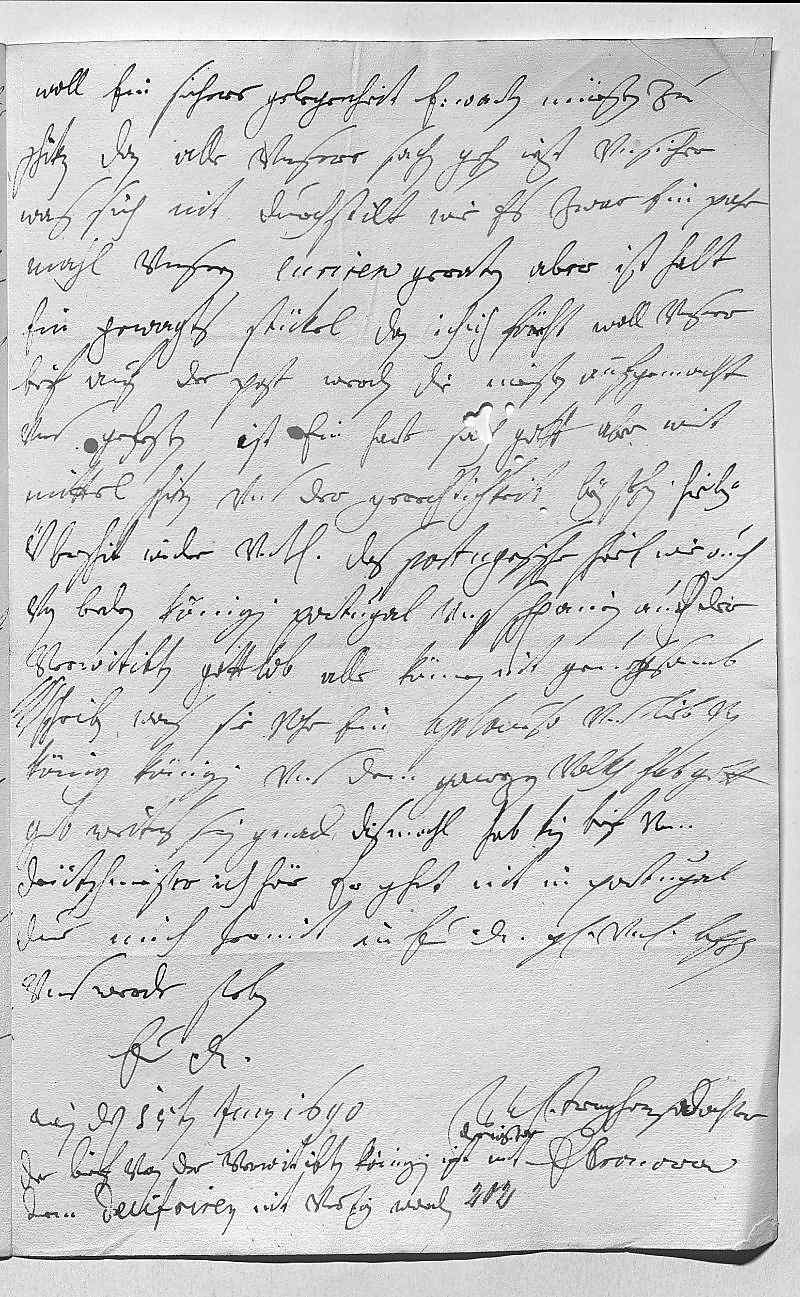 0037woll ein sichere gelegenheit erwarten müeßen zu 0038schiken, dan alle vnsere sachen gehn iezt vnsicher, 0039was sich nit durchstilt, wie es zwar ein pahr 0040mahl vnsern curiren geraten, aber ist halt 0041ein gewagts stükel, dan ich ich förcht woll, vnser 0042brif auf der post werden die meisten aufgemacht 0043vnd geleßen, ist ein hart sach. Gott aber wirt 0044mittel schiken vnd der gerechtichkeit bey stehen. Hirbey 0045überschik wider vnterdehnigst das portugesische schreiben wie auch 0046von beden Königin, Portugal vnd Schpanien, auch der 0047verwitibten . Gottlob, alle können nit genuegsamb 0048schreiben, was sie vohr ein aplauso vnd lieb von 0049König, Königin vnd dem ganzen volkh hab, gott 0050geb weiters sein gnad. Dismahl hab kein brif vom 0051Deütschmeister, ich hör, er gehet nit in Portugal . 0052Due mich hermit in ewer Durchlaucht gnade vnterdehnigst befehlen 0053vnd werde sterben 0054ewer Durchlaucht 0055vnterdehnigste trewgehorsamste dochter 0056Eleonora 0057Wien den 15ten junij 16900058Der brif von der verwitibten Königin ist der Wißer mit 0059dem decifriren nit vertig worden.
