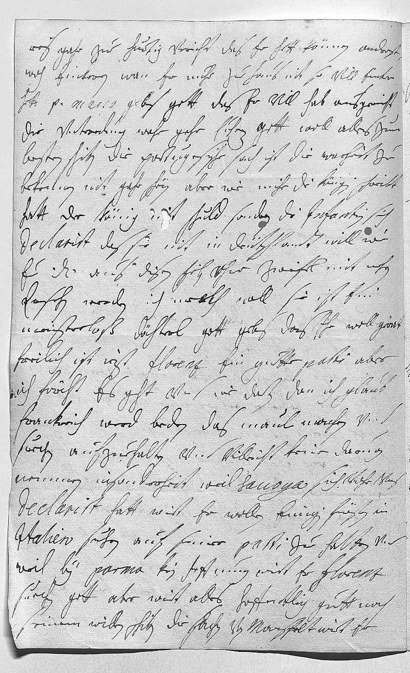 0016reis gahr zue hurtig vericht, das er hatt können anderst 0017woh einkeren, wan er nuhr zue haus nit so vill einker 0018hett. Pater Marco, gebs gott, das er vill hab ausgericht, 0019die vnteredung wahr gahr cuhrz, gott woll alles zum 0020besten schiken. Die portugesische sach ist, die warheit zu 0021bekennen, nit gahr schön, aber wie mihr die Königin schreibt, 0022hatt der König nit schuld, sondren die Infantin sich 0023declarirt, das sie nit in Deütschlandt will, wie 0024ewer Durchlaucht aus disen schreiben ohne zweifel mit nehern 0025ersehen werden. Ich merkh woll, sie ist ein 0026meisterloß döchterl, gott gebs, das ihr woll gerat. 0027Freilich ist iezt Florenz ein gutte parti, aber 0028ich förcht, es geht vns wie dorten, dan ich glaub, 0029Frankreich werd beden das maul machen vnd 0030suechen aufzuehalten, vnd villeicht keine daruon 0031nemmen. Insonderheit weil Sauoya sich vohr vns 0032declarirt hatt, wirt er wollen einigen fürsten in 0033Italien suchen auf seiner parti zue halten, vnd 0034weil bey Parma kein hoffnung ist, wirt er Florenz 0035suechen, gott aber wirt alles hoffentlich gutt nach 0036seinem willen schiken. Die sachen von Mansfelt, wirt er