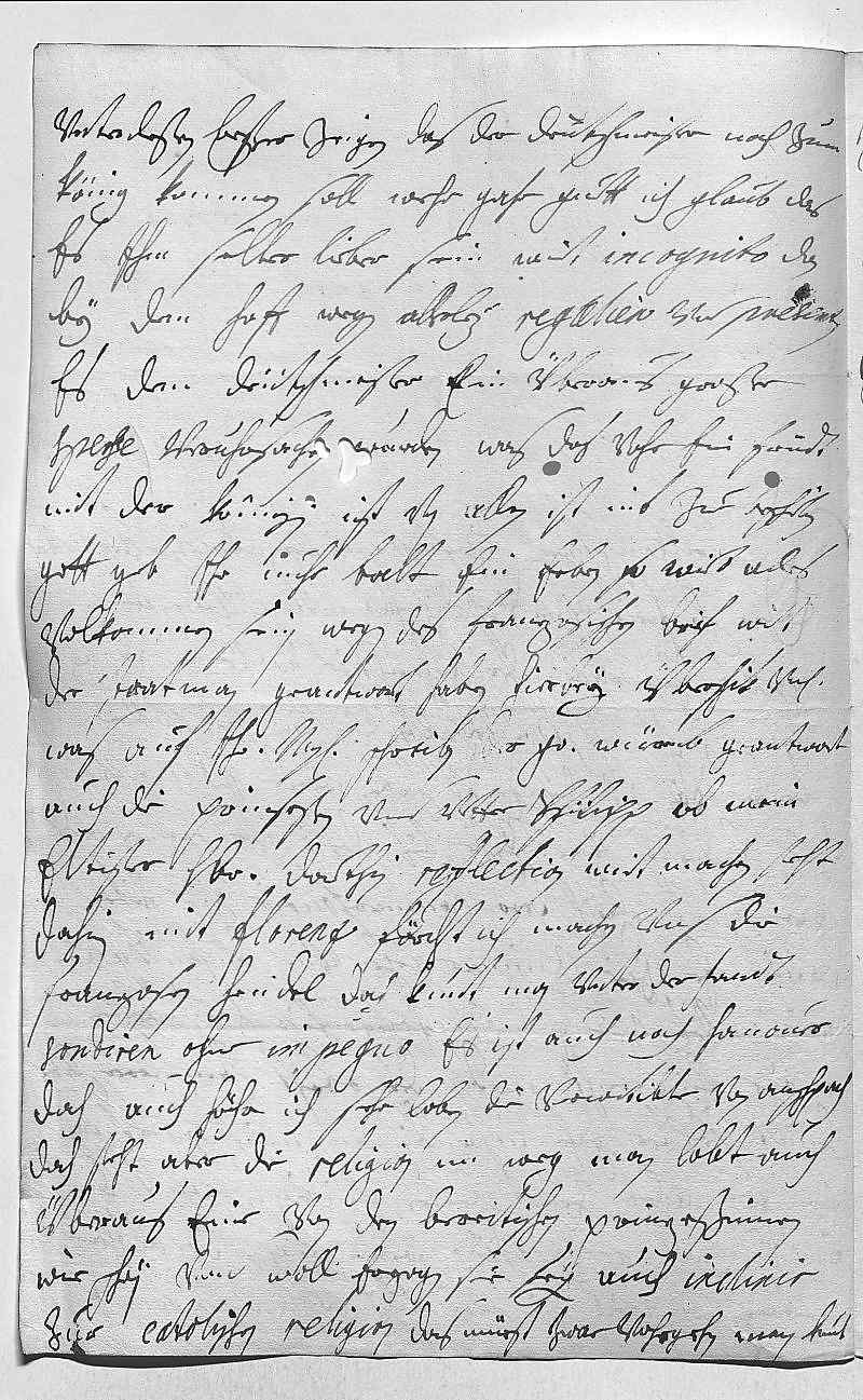 0015vnterdeßen beßer zeigen. Das der Deütschmeister noch zum 0016König kommen soll, wehr gahr guett, ich glaub, das 0017es ihm selber lieber sein wirt incognito, dan 0018bey dem hoff, wegen allerley regalien vnd presenten 0019es dem Deütschmeister ein überaus große 0020spese veruhrsachen wurden. Was das vohr ein freüdt 0021mit der Königin ist von allen, ist nit zue beschreiben, 0022gott geb ihr nuhr balt ein erben, so wirt alles 0023volkommen sein. Wegen des franzosischen brif wirt 0024der Stratman geantwort haben. Hierbey überschik vnterdehnigst, 0025was auf ihr Mayestät schreiben der Grav Würmb geantwort, 0026auch die Prinseßin vnd vetter Pfilipp . Ob mein 0027eltister herr bruder dorthin reflection wirt machen, steht 0028dahin. Mit Florenz, förcht ich, machen vns die 0029franzosen hendel, doch kunt man vnter der handt 0030sondiren, ohne impegno. Es ist auch noch Hanouer 0031dah, auch höhr ich sehr loben die verwitibte von Anschpach, 0032dah steht aber die religion im weg. Man lobt auch 0033überaus eine von den bereitischen Prinzeßinnen, 0034wie schön vnd woll erzogen sie sey, auch inclinir sie0035zur catolischen religion. Das müest zwar vohrgehen, man kunt