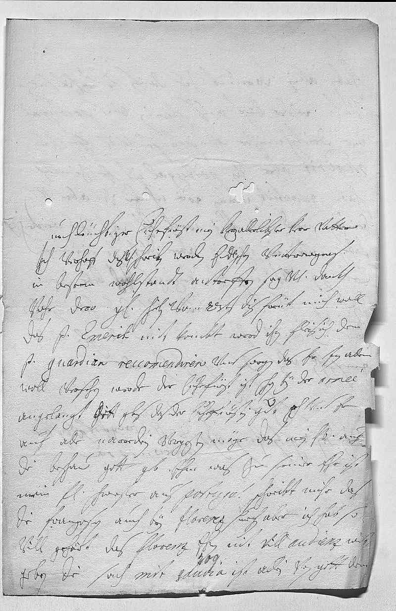 0001Durchleüchtiger Cuhrfürst, mein herzallerlibster herr vatter 0002Ich verhoff, dis vnterdehnigste schreiben werden ewer Durchlaucht vntrewegens 0003in bestem wohlstandt antreffen. Sag vnterdehnigsten dankh 0004vohr dero gnädiges schreiben vom 23ten dis. Freüt mich woll, 0005das Pater Emerik mit kombt, werd ihn fleisich dem 0006Pater Guardian reccomendiren vnd sorgen, das er in allem 0007woll versehen werde. Der Cuhrfürst ist schon bey der armeé 0008angelangt. Gott gebs, das der Cuhrfürstin gut geh vnd er 0009auf alle narredein vergeßen möge. Das mein herr bruder auf 0010die beschaw, gott geb ihm, was zu seiner ehr ist. 0011Mein fraw schwester aus Portugal schreibt mihr, das 0012die franzosen auch bey Florenz suechen, aber ich hab so 0013vill gehört, das Florenz ihnen nit vill audienz wirt 0014geben. Die sach mit Sauoia ist allein von gott, dem