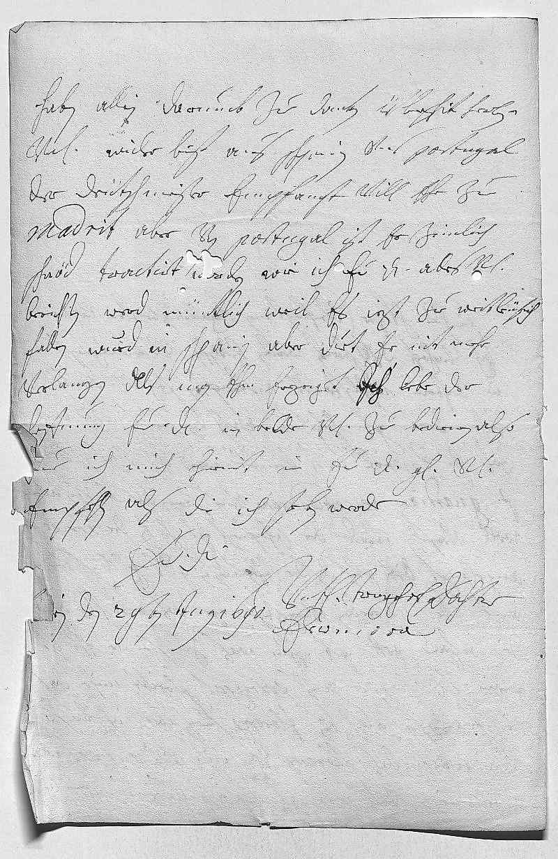 0015haben allein darumb zue danken. Überschik herbey 0016vnterdehnigst wider brif aus Schpanien vnd Portugal . 0017Der Deütschmeister empfangt vill ehr zue 0018Madrit, aber von Portugal ist er zimlich 0019schnöd tractirt worden, wie ich ewer Durchlaucht alles vnterdehnigst 0020berichten werd müntlich, weil es iezt zue weitleüfich 0021fallen wurd. In Schpanien aber duet er nit mehr 0022verlangen, als man ihm erzeiget. Ich lebe der 0023hoffnung, ewer Durchlaucht in belde vnterdehnigst zue bedienen, also 0024due ich mich hirmit in ewer Durchlaucht gnade vnterdehnigst 0025empfehlen, als die ich sterben werde 0026ewer Durchlaucht 0027vnterdehnigste trewgehorsamste dochter 0028Eleonora 0029Wien den 29ten junij 1690
