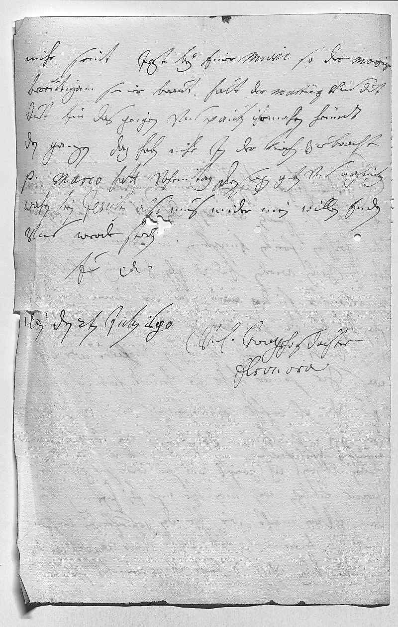 0016mihr seint jezt bey einer music, so der morgige 0017breütigam seiner braut halt, der Martiniz, vnd dut 0018duet ein das geigen vnd pauken ihr machen. Heündt 0019den ganzen dag haben mihr in der kirchen zuebracht, 0020Pater Marco hatt vohrmitag den segen geben vnd nachmitag 0021wahren bein jesuiten, also mues wider mein willen enden 0022vnd werde sterben 0023ewer Durchlaucht 0024vnterdehnigste trewgehorsamste dochter 0025Eleonora 0026Wien den 2ten julij 1690