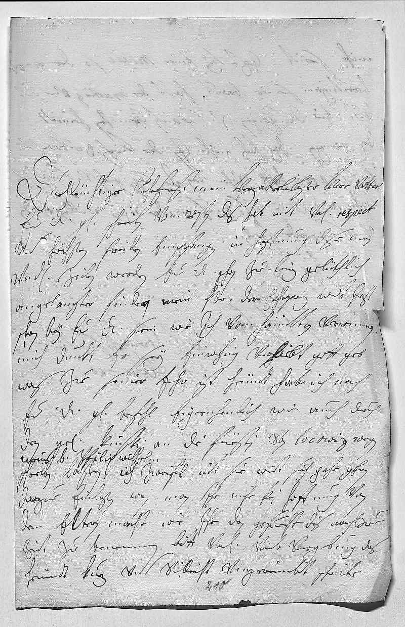 0001Durchleüchtiger Cuhrfürst, mein herzallerliebster herr vatter 0002Ewer Durchlaucht gnädiges schreiben vom 27ten dis hab mit vnterdehnigstem respect 0003vnd höchsten freiden empfangen in hoffnung, dise mein 0004vnterdehnigste zeilen werden ewer Durchlaucht schon zue Linz gelükhlich 0005angelangter finden. Mein herr bruder, der Cuhrprinz, wirt jezt 0006schon bey ewer Durchlaucht sein, wie ich vom Hamilton vernommen. 0007Mich dunkt, er sey einwehnig verliebt, gott geb, 0008was zue seiner ehr ist. Heündt hab ich nach 0009ewer Durchlaucht gnädigen befehl eigenhendich, wie auch durch 0010den Graven Kinski, an die Fürstin von Locowiz wegen 0011meines bruders Pfilip Wilhelm schreiben laßen. Ich zweifel nit, sie wirt sich gahr gehrn 0012dazue einlaßen, wan man ihr nuhr kein hoffnung von 0013dem eltern macht, wie ihr dan gesuecht, dis noch zur 0014zeit zu benemmen. Bitt vnterdehnigst vmb vergebung, das 0015heündt kurz vnd villeicht vngereimbt schreibe,